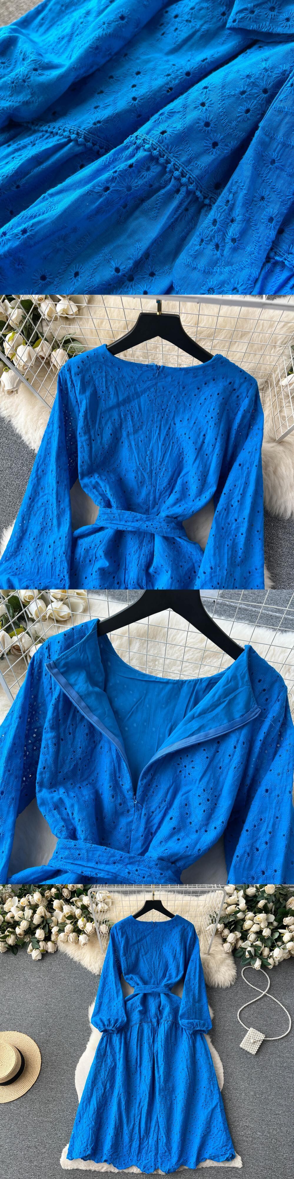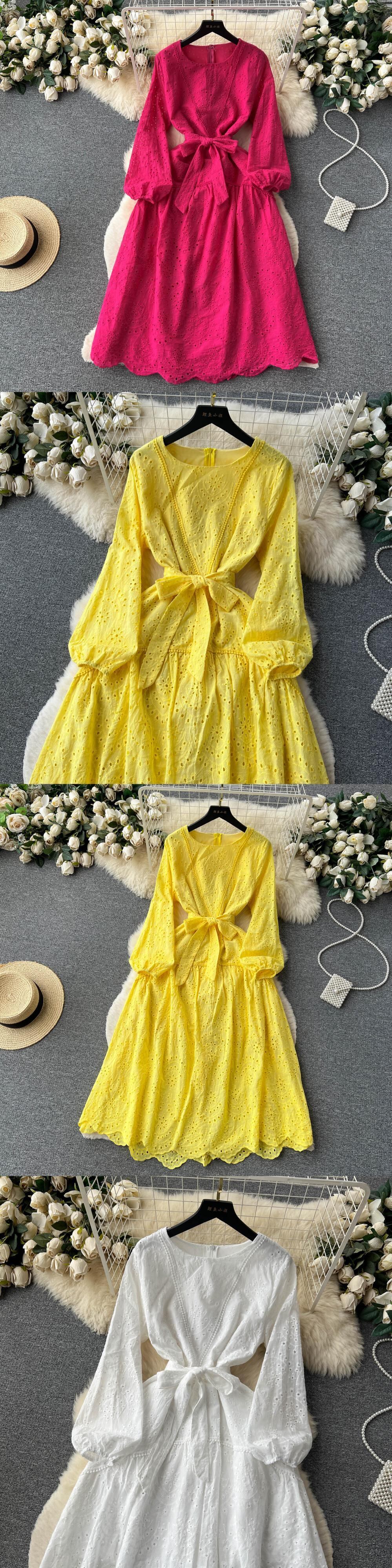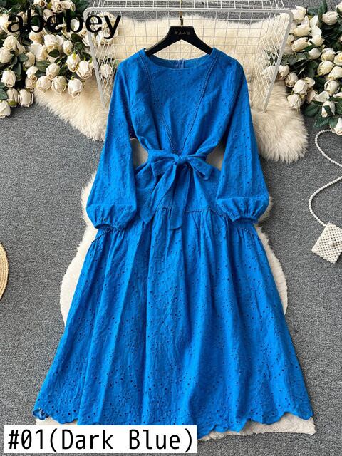 フレンチレトロレースセクシードレスOネックロングランタンスリーブ弾性ウエストソリッド気質中空スリムロングドレス エラスティック 伸縮 ソリッドカラー