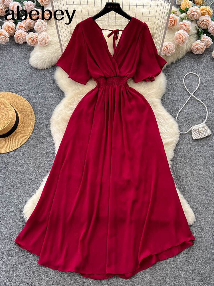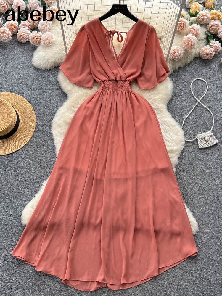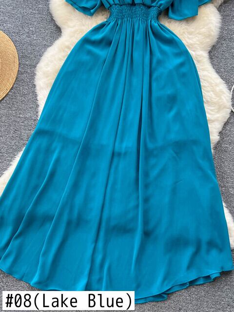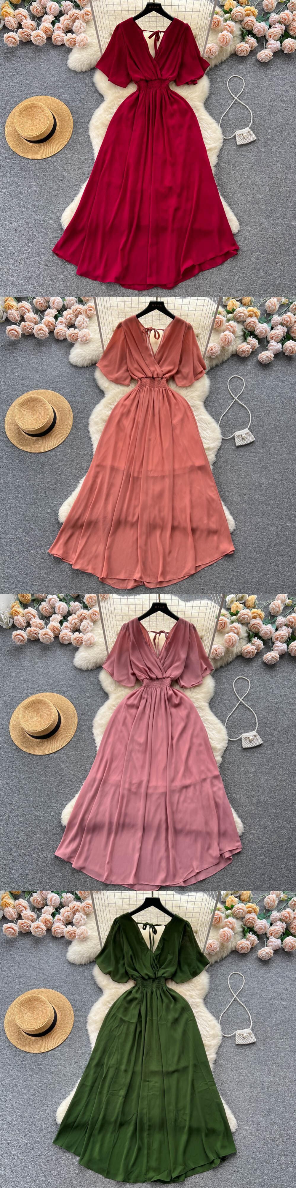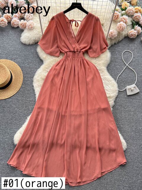 シフォンロングドレス V ネック半袖シャーリング A ラインドレス夏ボヘミアンプリントビーチドレス ショート ハーフスリーブ サマー 夏物 Vネック Aライン ソリッドカラー