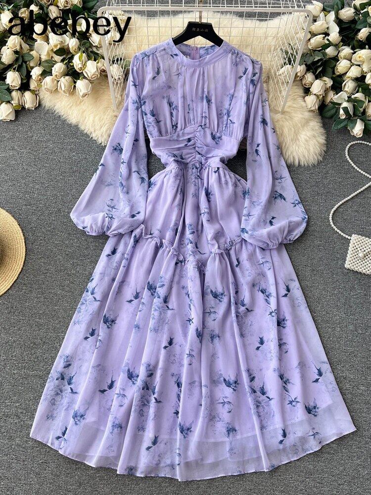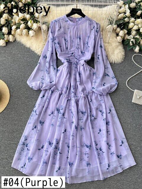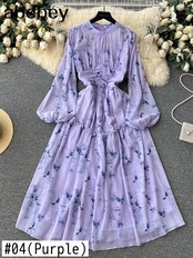 秋花柄プリントシフォンロングドレスランタンスリーブ O ネックパープル/レッド/イエローマキシ Vestido オータム 秋物 Oネック