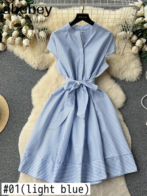 オフィスレディストライプサンドレスくるみボタンベルトリボン半袖優しいスタイル夏 A ラインドレス ショート レッド ハーフスリーブ サマー 夏物 ハーネス Aライン 会社 学校 通勤や通学にも