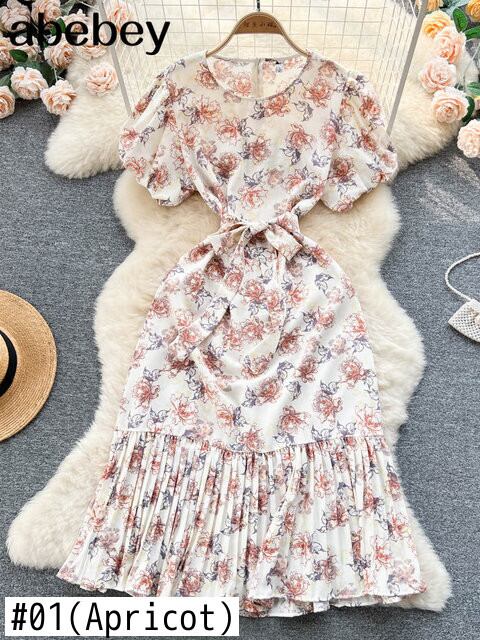 シック花柄ドレス O ネックショートパフスリーブベルトボウプリーツジッパー甘いホリデービーチパーティーサンドレス リボン 大人ガーリー スウィート キュート カジュアル ハーネス Oネック
