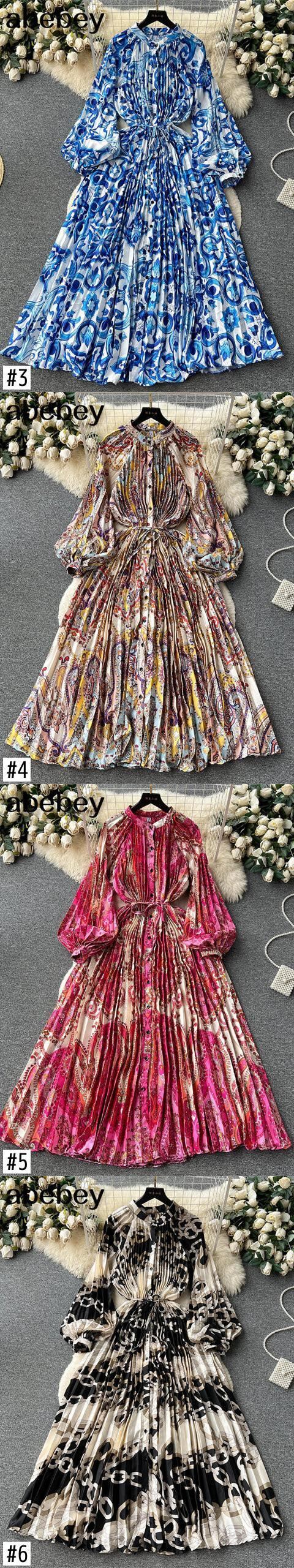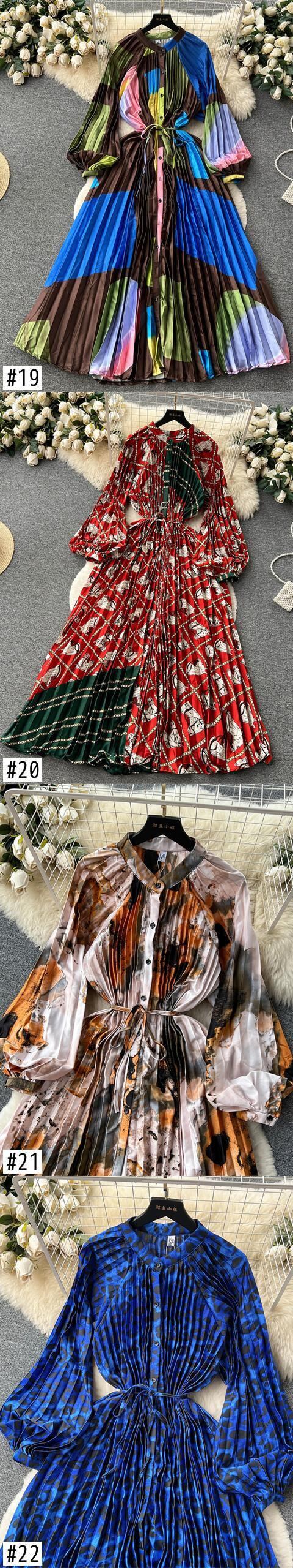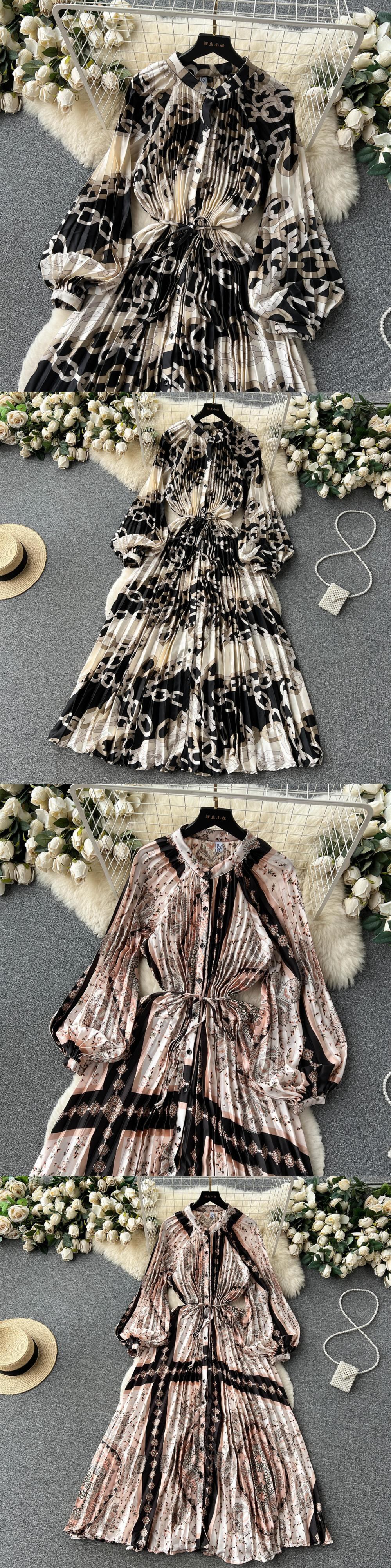 フレンチプリントプリーツドレスレトロシングルブレスト長袖Aラインドレス秋休暇ロングドレス オータム 秋物