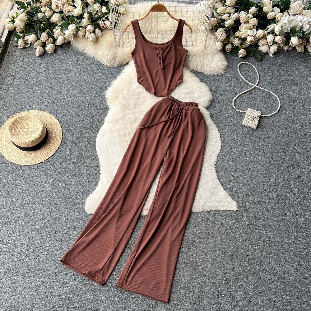ストラップセクシースーツ中空アウトキャミソール + ワイドレッグロングパンツセットアメリカンレトロビーチ 2 枚ジャージ ワイドパンツ