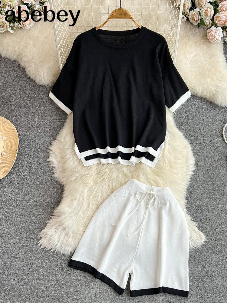 基本的 O ネック春夏 T シャツセットニットルーズツーピース半袖トラックスーツレディースショーツスーツ ショート ハーフスリーブ スプリング 春物 サマー 夏物 ブルマー Oネック Tシャツ