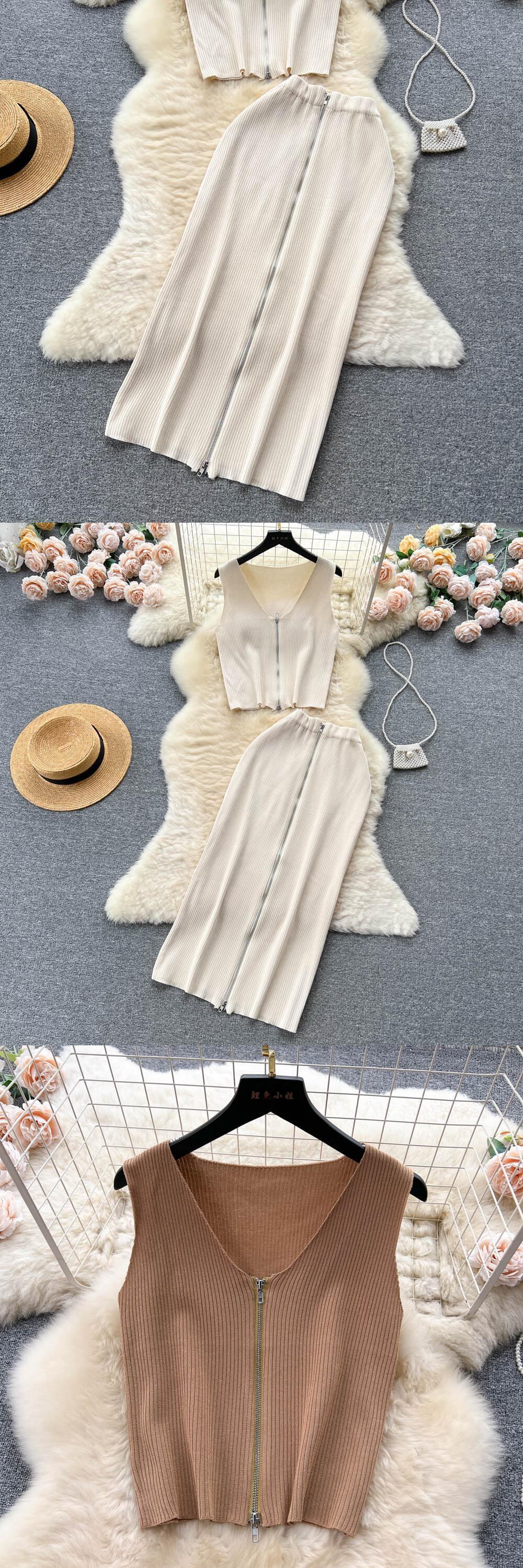 夏ニットスーツノースリーブショートトップス + 弾性ミディスカートストリート 2 個セット エラスティック 伸縮 サマー 夏物 ソリッドカラー