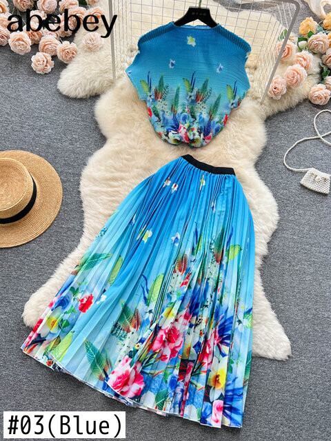 夏花柄ボヘミアンプリント 休暇ビーチ 2 個セット半袖トップスとウエストプリーツロングスカートスーツ ショート ハーフスリーブ サマー 夏物