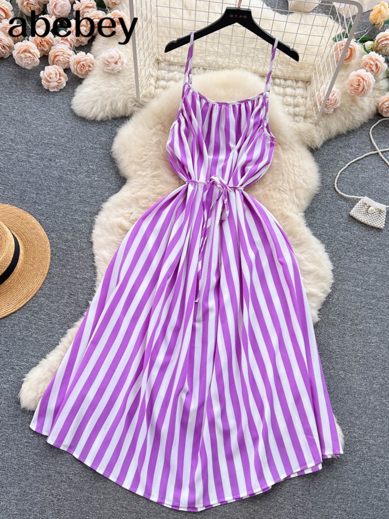 休暇サンドレスレースアップストラップストライププリントバックレス弾性スタイルスイートビーチパーティー A ラインドレス エラスティック 伸縮 大人ガーリー スウィート キュート カジュアル Aライン