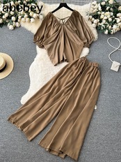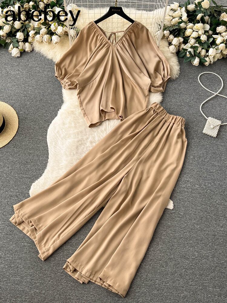 プリーツ 2 ピースパンツセット春夏ストリート半袖ディープ V ネックシャツ + ストレートレッグパンツルーズ衣装 ショート ハーフスリーブ スプリング 春物 サマー 夏物 Vネック