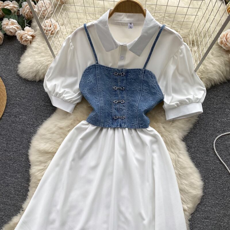 服衣装ソリッドカラー半袖ホワイトベーシックシャツドレスデニムベスト 2 点セット衣装服 ショート ハーフスリーブ