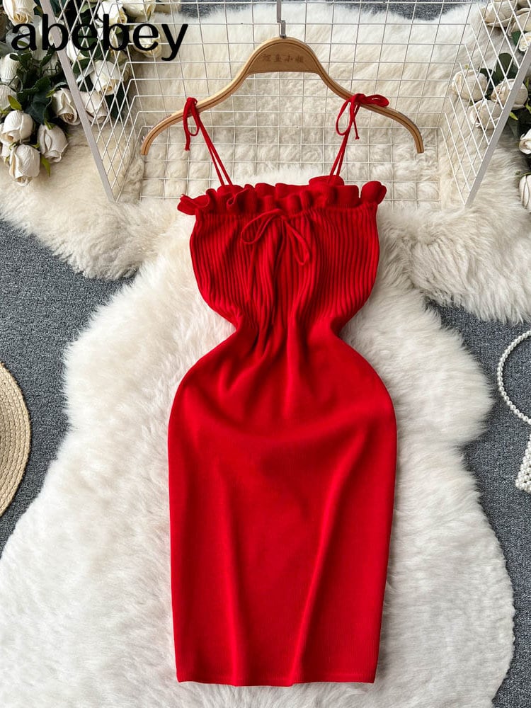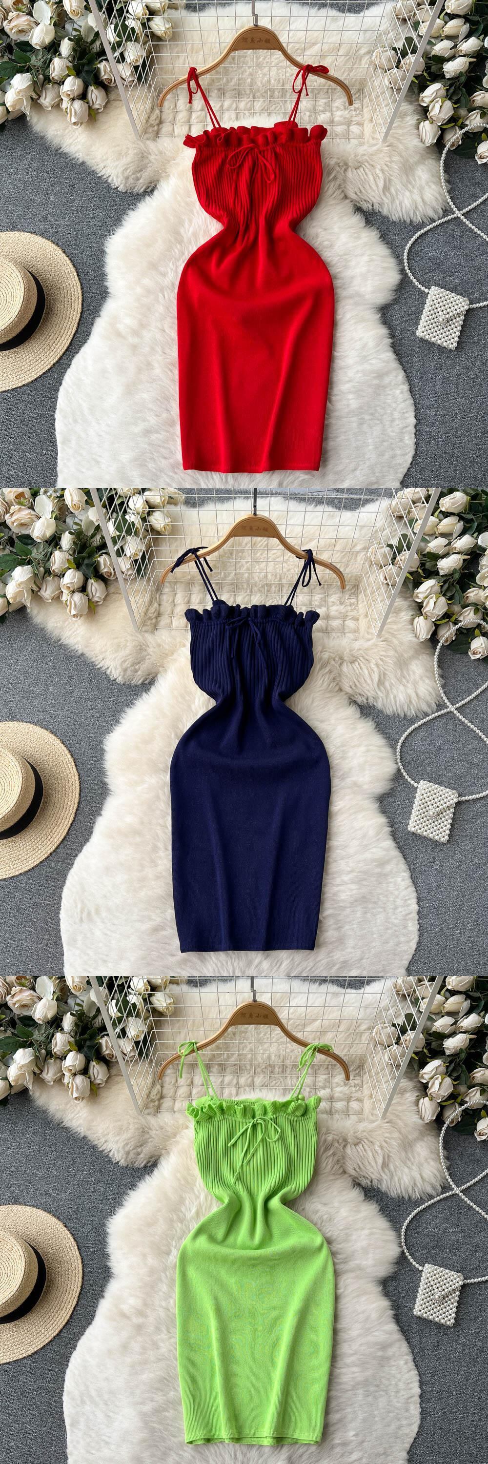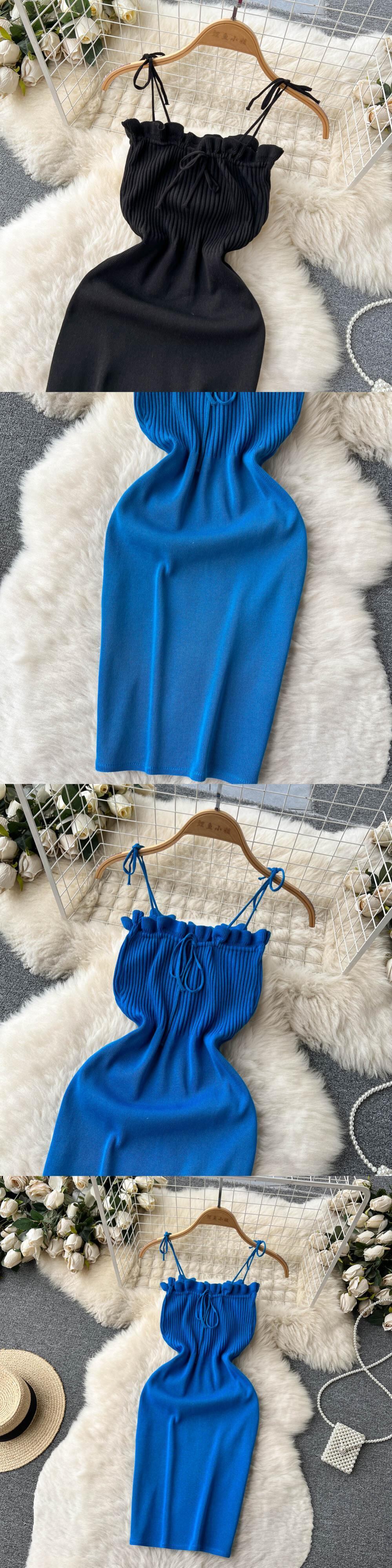 ブルーペンシルドレスストラップボディコンセクシー Vestidos Kpop 弾性ニットサマーミディドレス エラスティック 伸縮 夏物