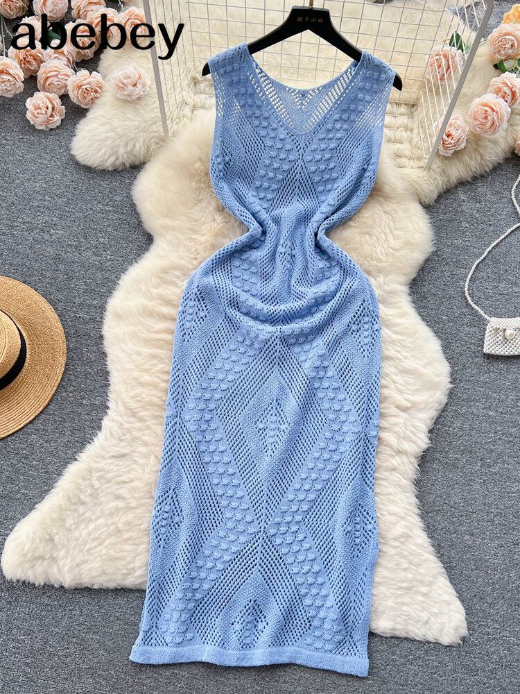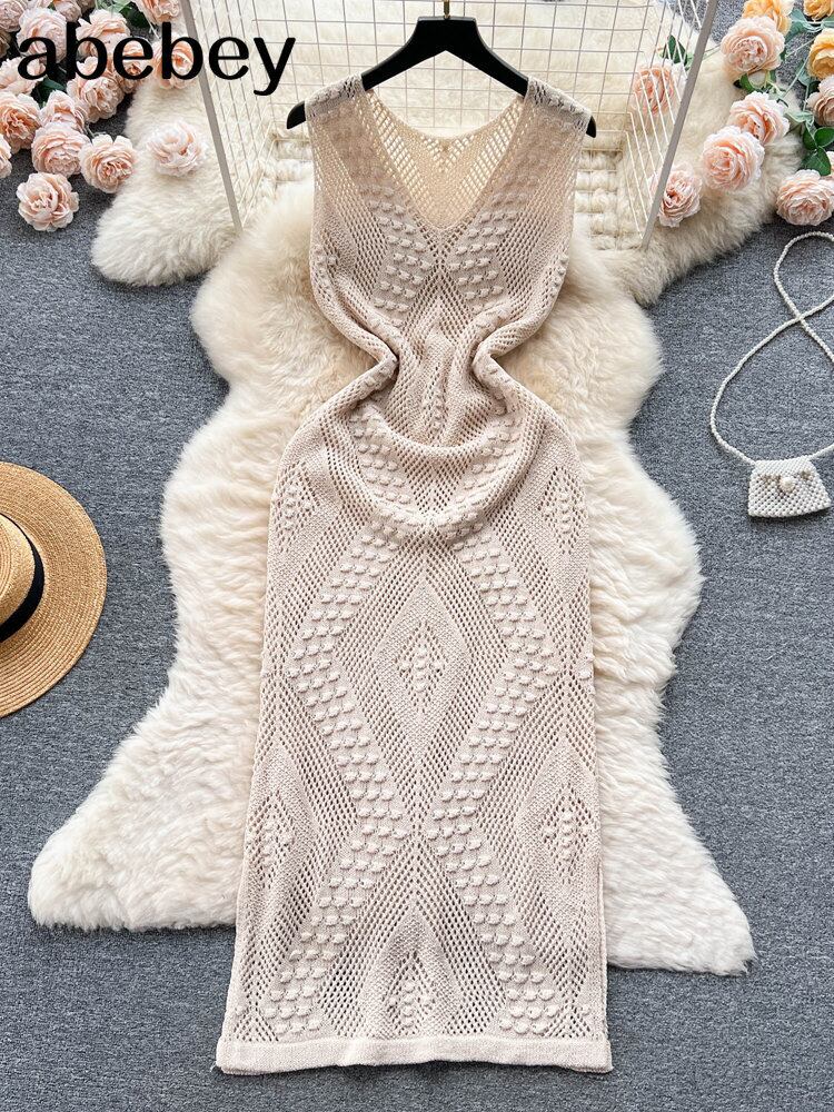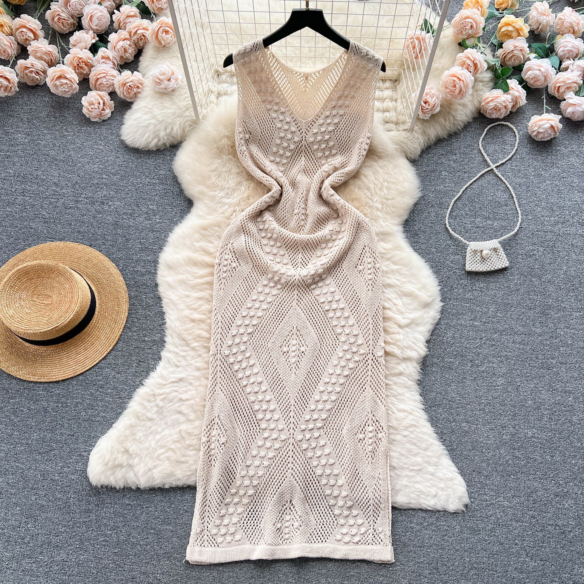 ニットスプリットドレスノースリーブ V ネックフックフラワー中空夏トレンドセクシースリムドレス サマー 夏物 Vネック フラワーデザイン