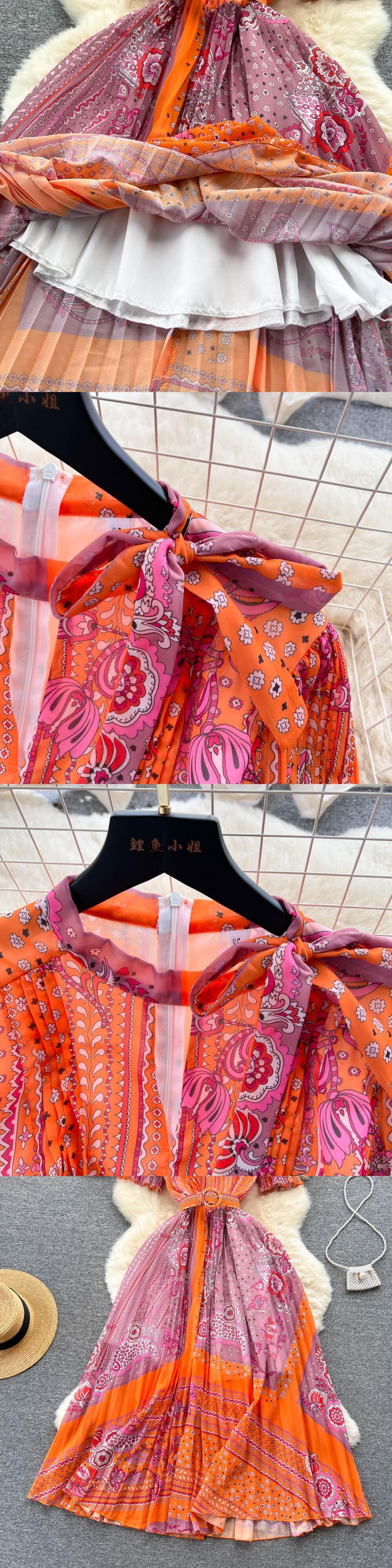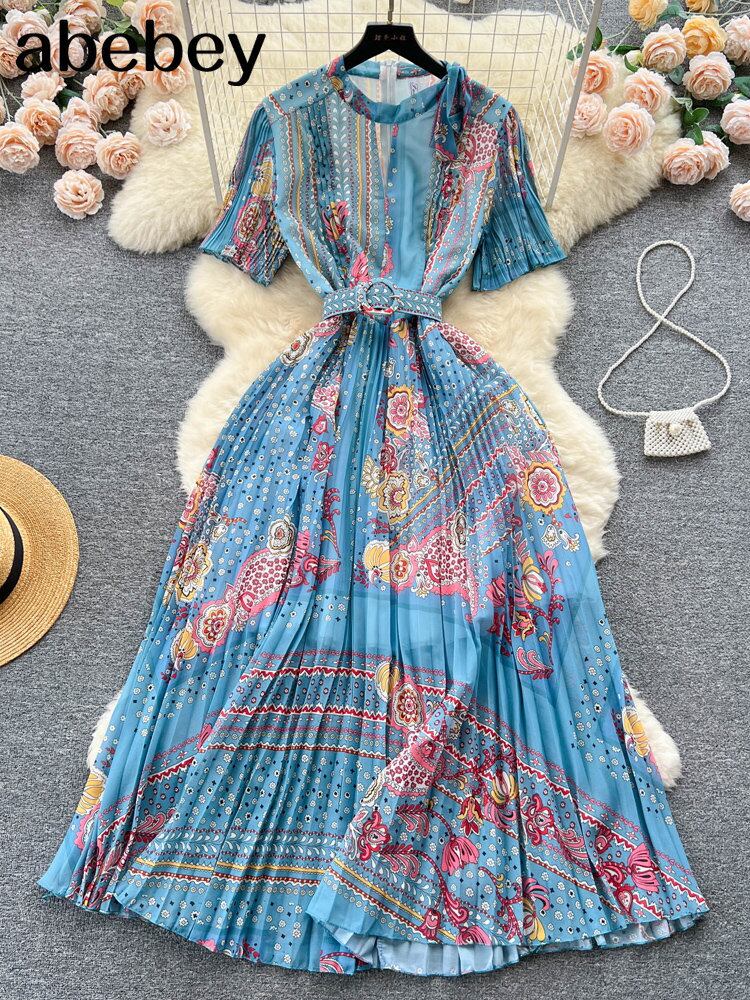 夏ボヘミアン花柄プリーツミディドレスラウンドネックパフスリーブウエスト A ラインドレープビーチ Vestidos サマー 夏物 Oネック Aライン
