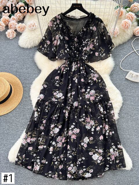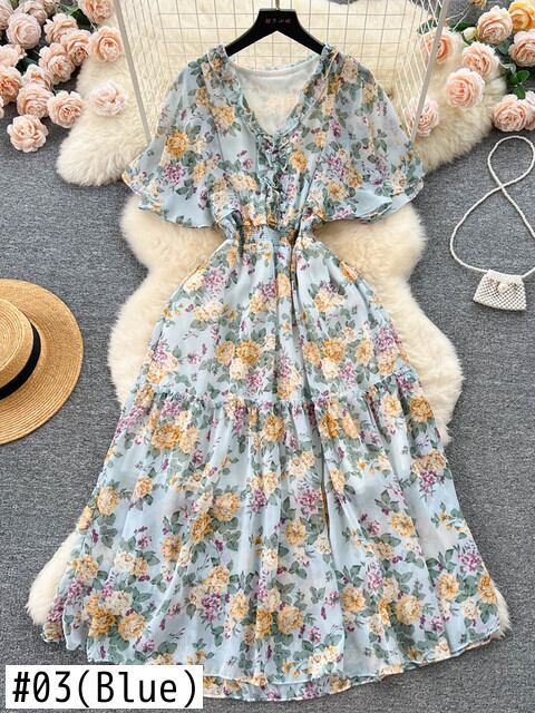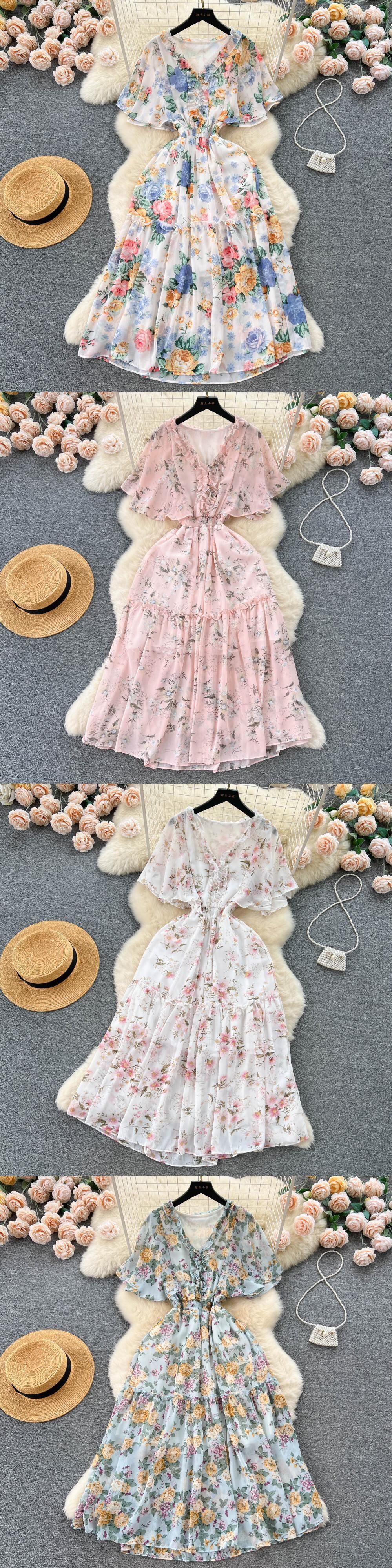 フレンチセクシープリントドレス弾性ウエスト V ネックシャーリングフレアスリーブ夏ビーチ休暇花柄ロングドレス レッド エラスティック 伸縮 サマー 夏物 Vネック