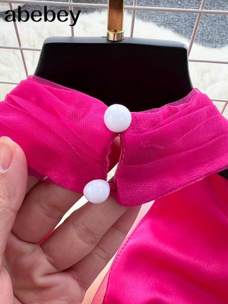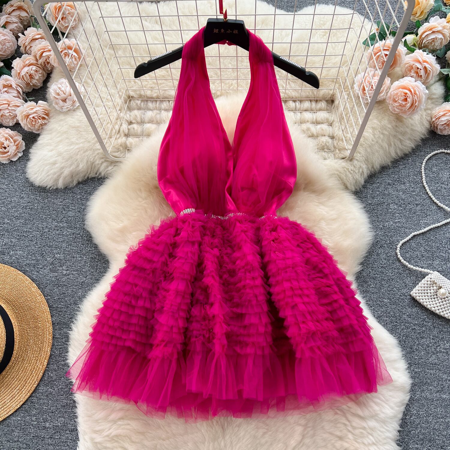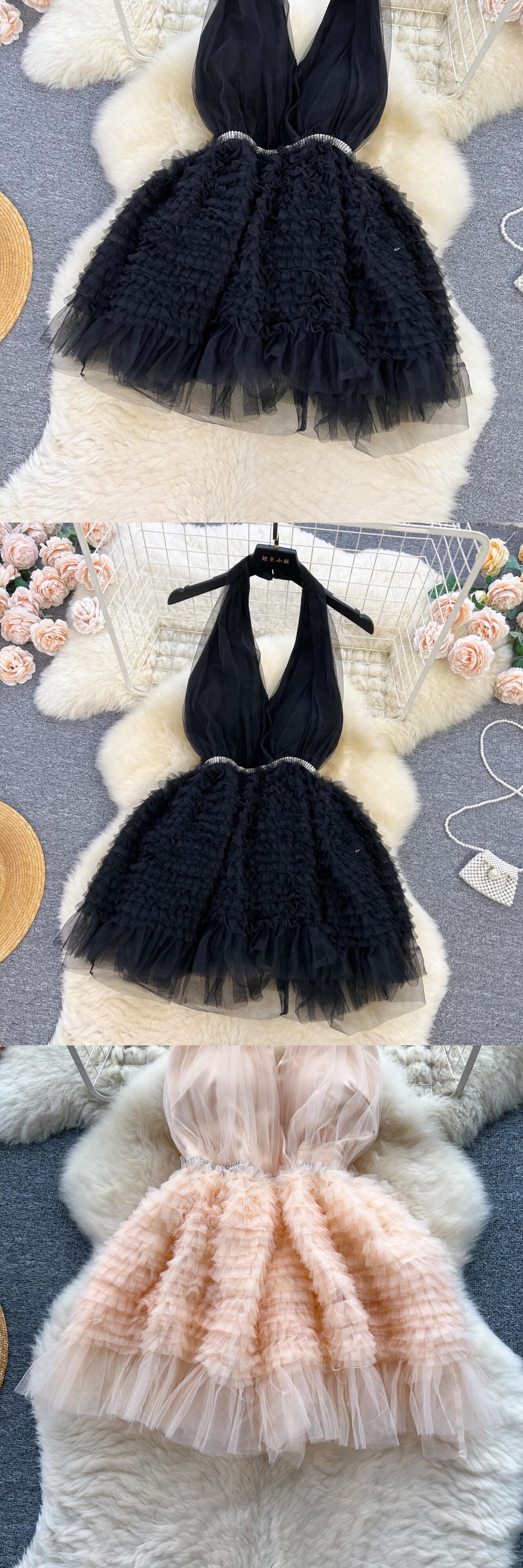 ホルターディープ V ネックセクシーケーキドレスノースリーブビーズ背中開いたチュチュドレスストリートショートセクシーメッシュサンドレス Vネック パニエ ペチコート