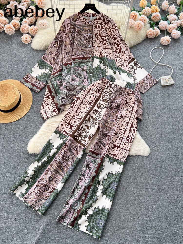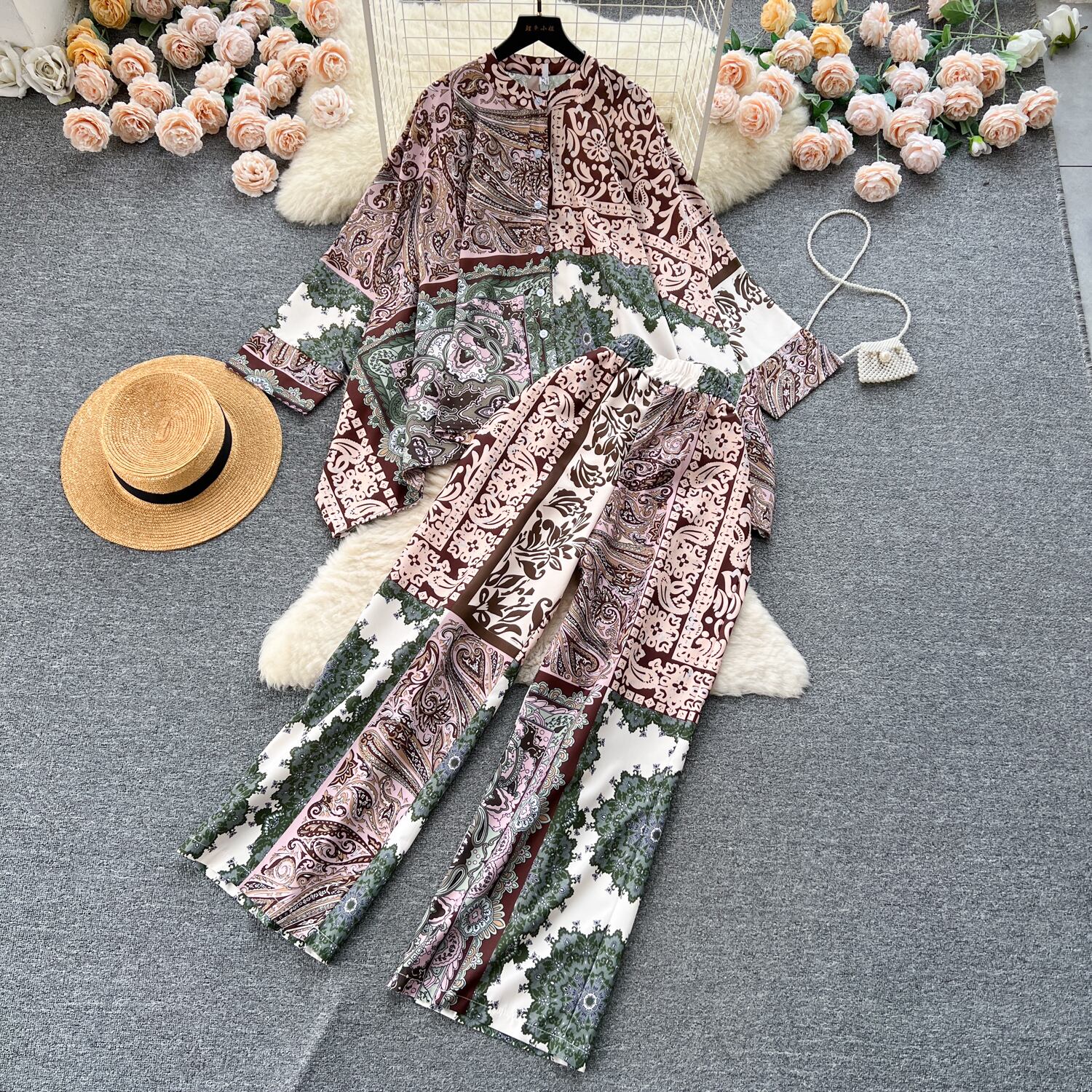 サイドポケットストレッチウエストワイドレッグパンツ 2 点セットサテンテクスチャプリントケープシャツ ワイドパンツ シルク
