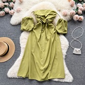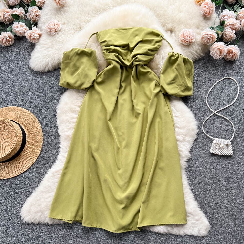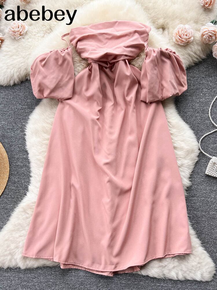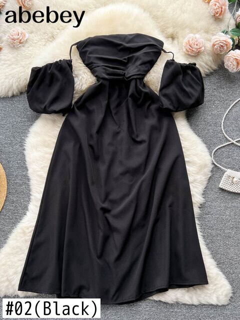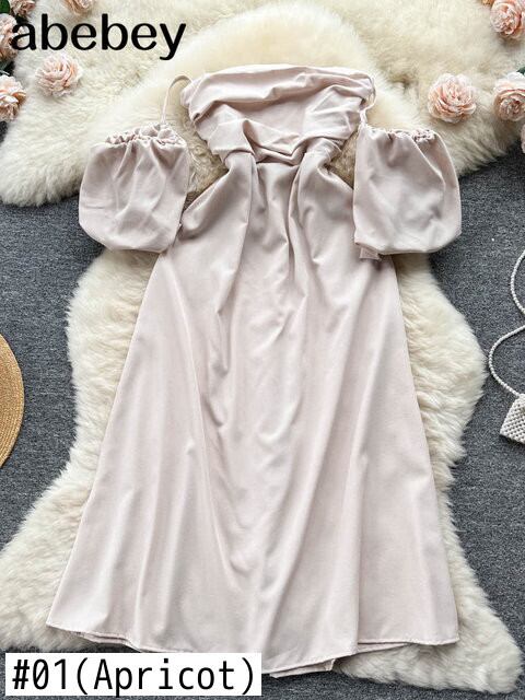セクシードレスオフショルダーストラップレスパフ半袖ミディドレスフレンチスタイルシンプル Vestidos ショート ハーフスリーブ ソリッドカラー