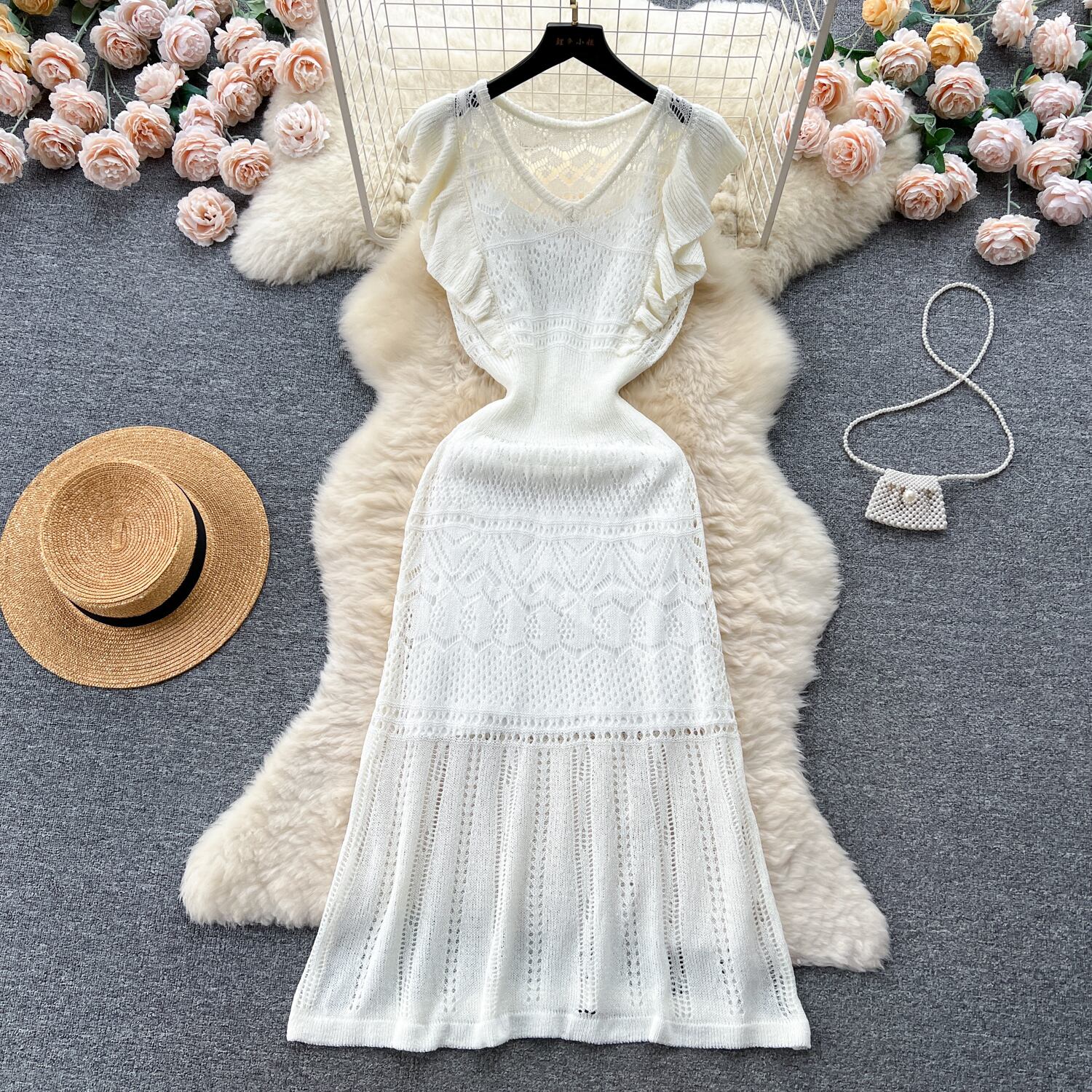 フレンチニットロングドレス V ネックフリルノースリーブ弾性ウエスト気質オフィスレディドレス ラッフル エラスティック 伸縮 Vネック 会社 学校 通勤や通学にも