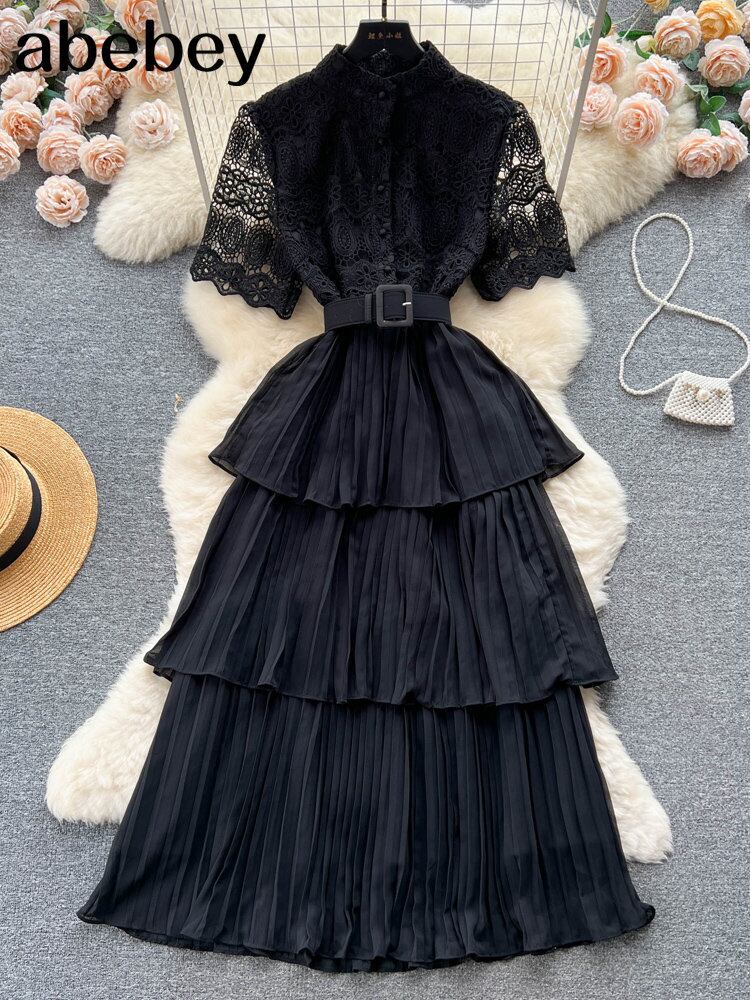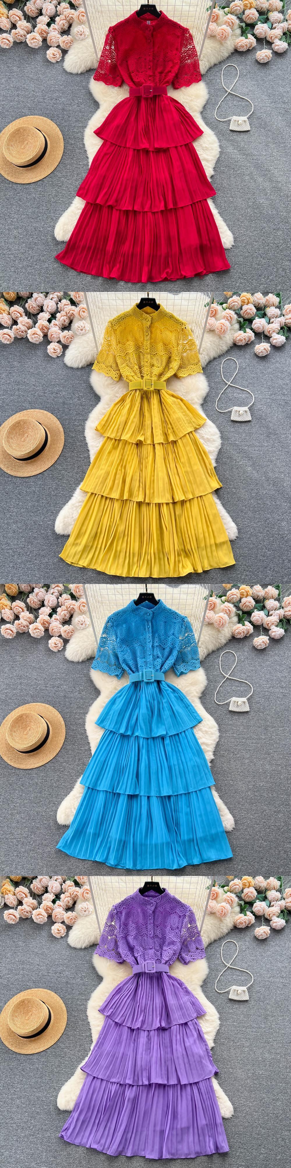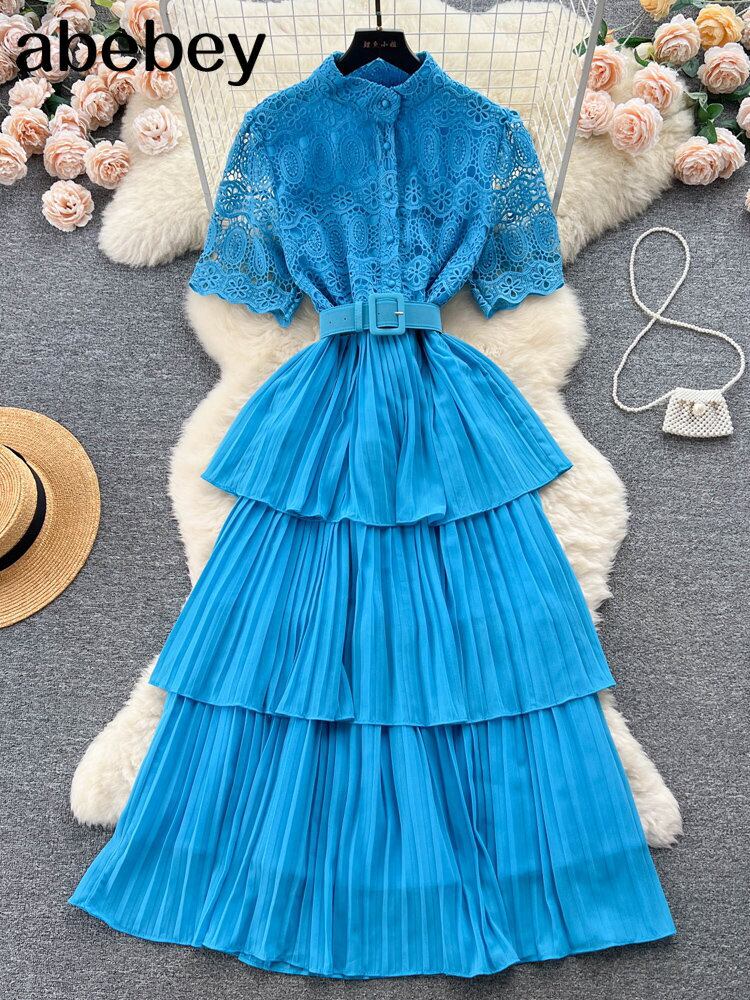 ストリートプリーツドレスショートパフスリーブレース中空アウトベルトジッパー夏優しいロングサンドレス サマー 夏物 ハーネス ソリッドカラー