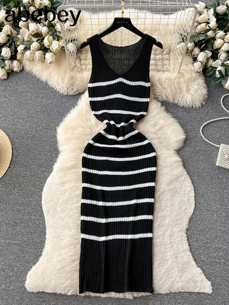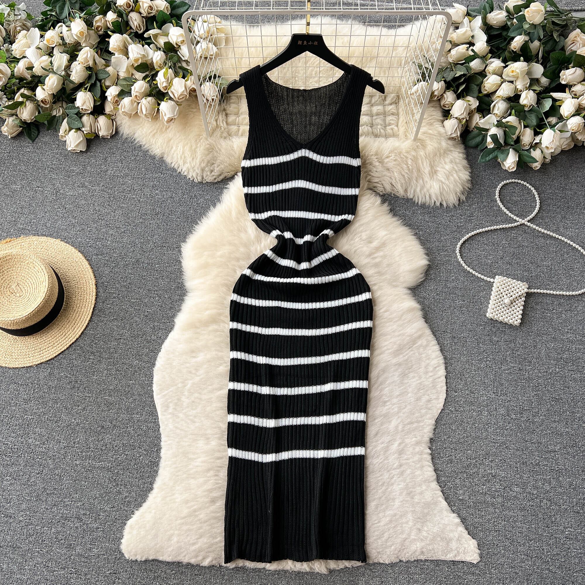 中空かぎ針編みニットドレスビーチスリムノースリーブ V ネックセクシーサマーパーティースプリットマキシドレスブラック 夏物 Vネック