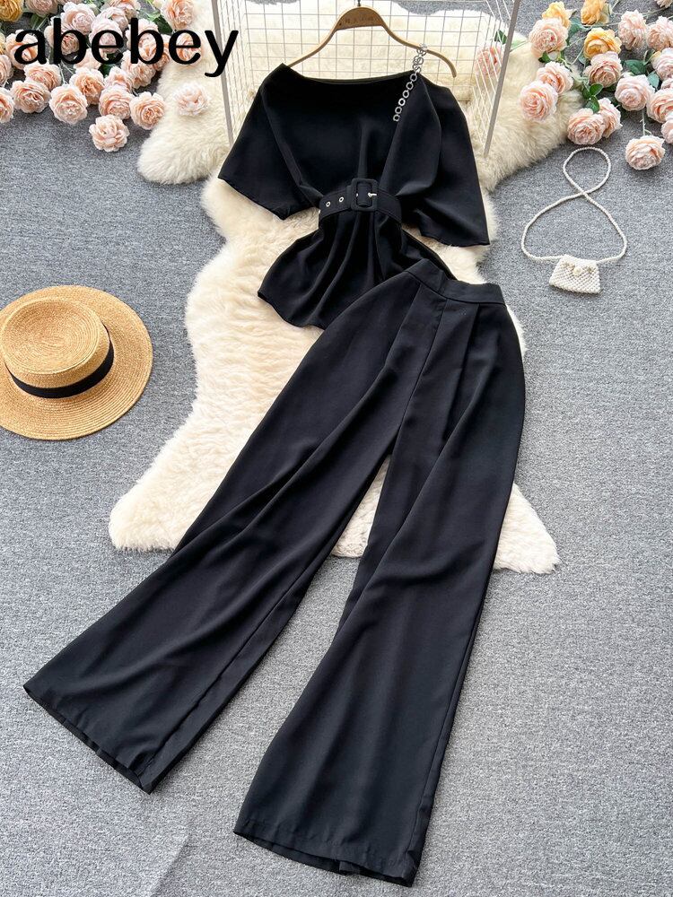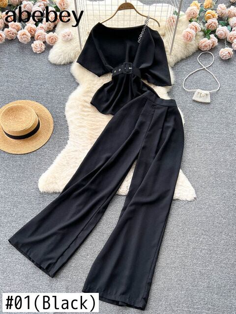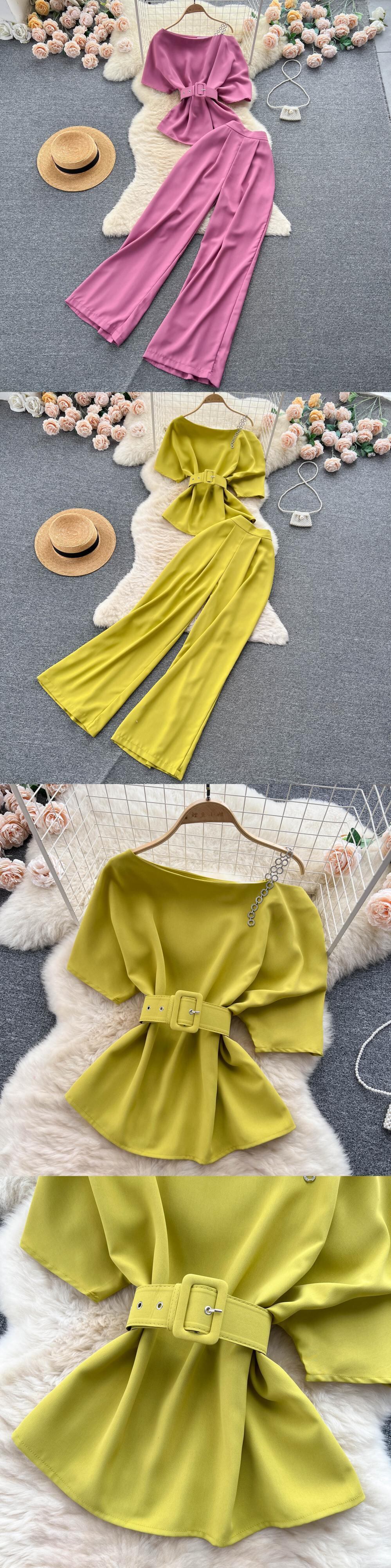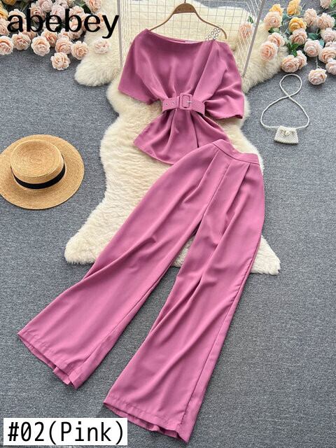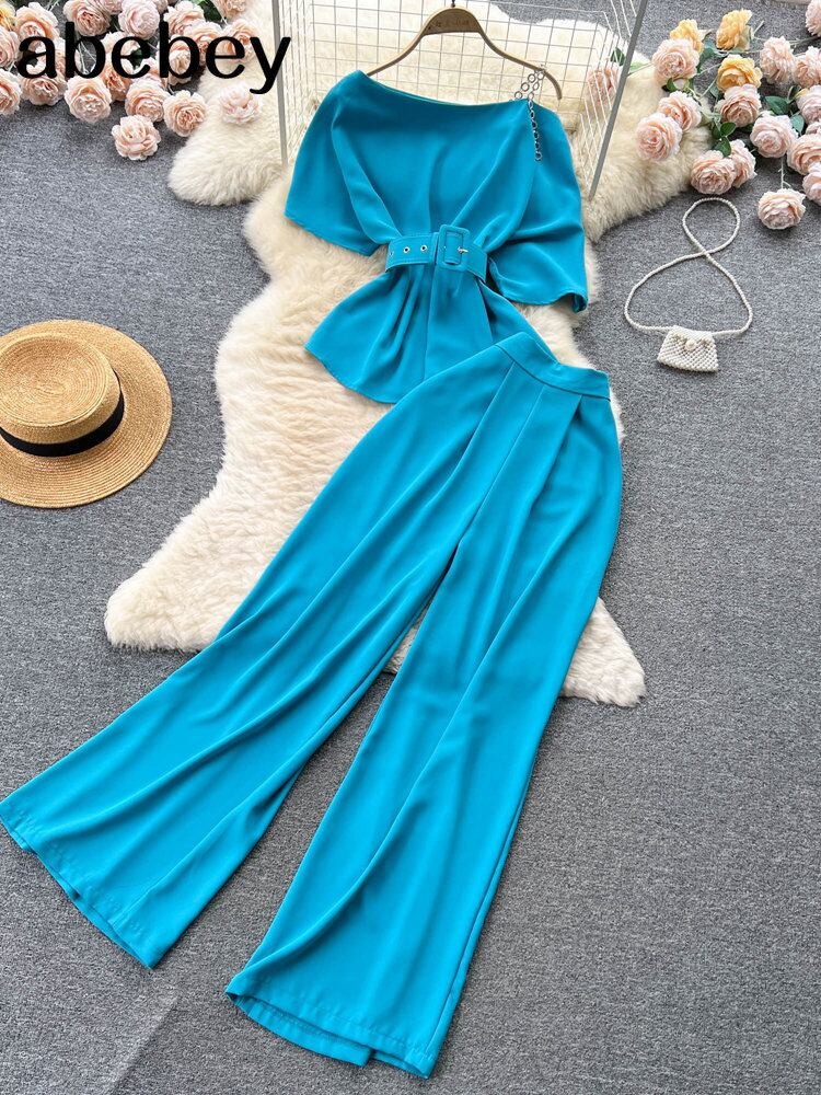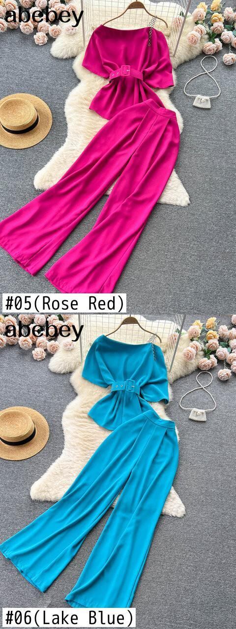ブルー/レッド 2 ピースパンツスーツセットワンショルダー半袖ベルトクロップトップス + ワイドレッグルーズロングパンツ衣装 ショート ハーフスリーブ ハーネス ワイドパンツ ソリッドカラー
