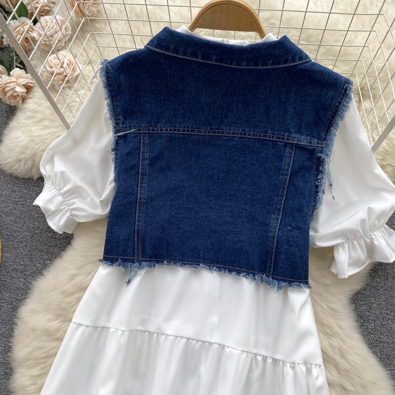 服衣装ソリッドカラー半袖ホワイトベーシックシャツドレスデニムベスト 2 点セット衣装服 ショート ハーフスリーブ