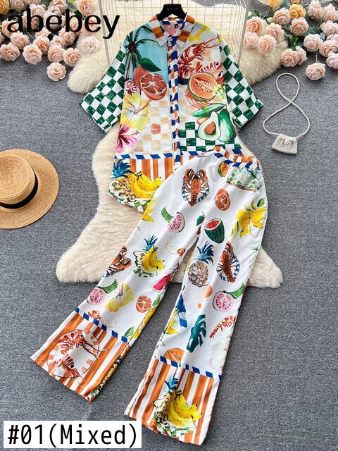 プリントシャツ 2 点セットルーズ半袖シングルブレストスーツ夏ウエストワイドレッグパンツセット ショート ハーフスリーブ サマー 夏物 ワイドパンツ