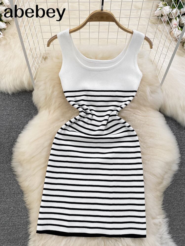 ストリップ O ネックスリム夏セクシーニットミディドレススパゲッティストラップ Vestido デフェスタパーティーボディコン膝丈 Vestidos サマー 夏物 Oネック