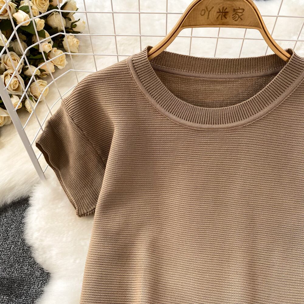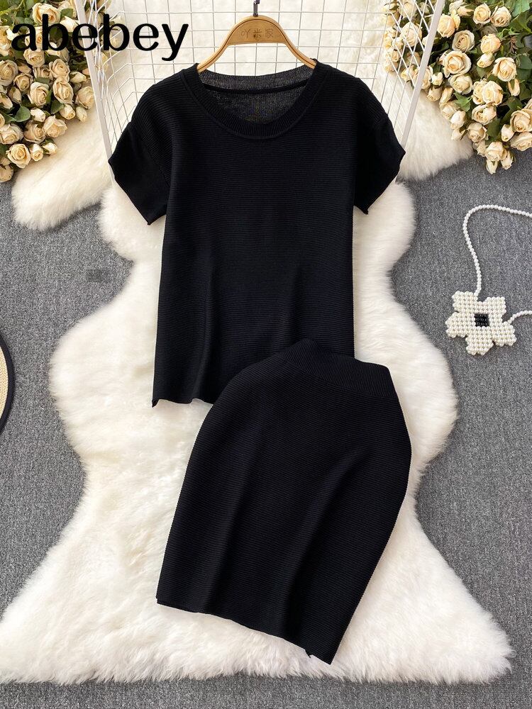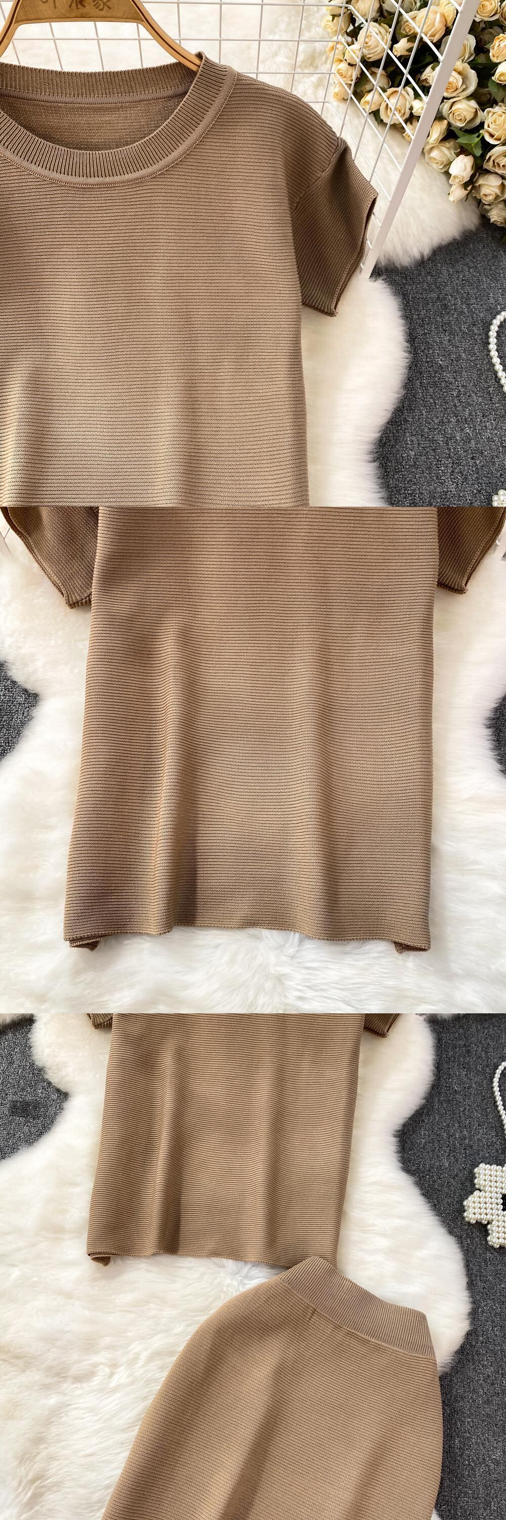 2 ピースセットスーツスカート O ネック半袖クロップトップとウエストニットミニスカート ショート ハーフスリーブ Oネック