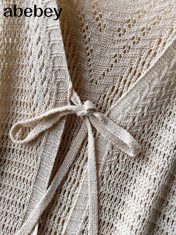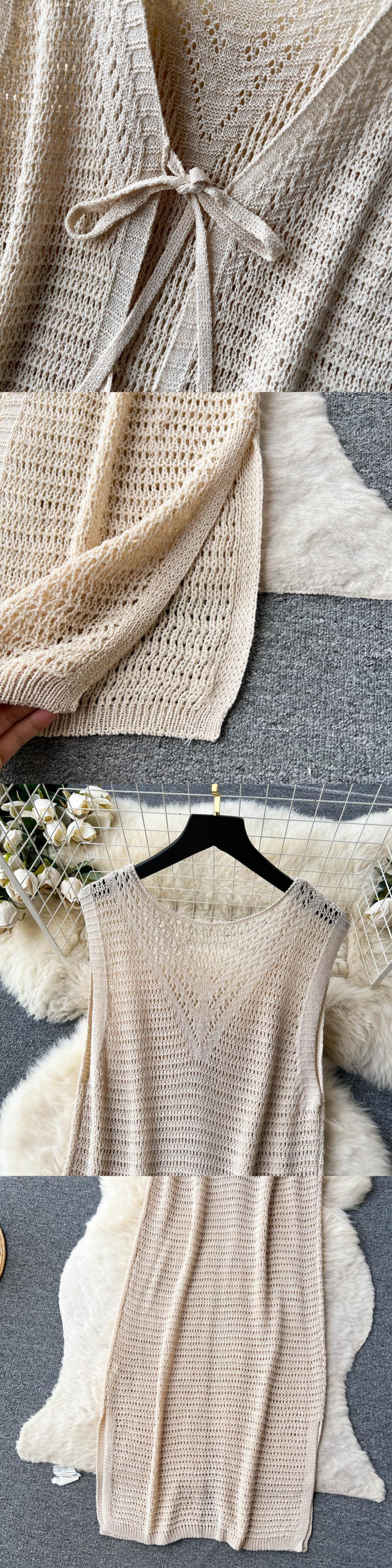 ニットスプリットドレスノースリーブ V ネックフックフラワー中空夏トレンドセクシースリムドレス サマー 夏物 Vネック フラワーデザイン