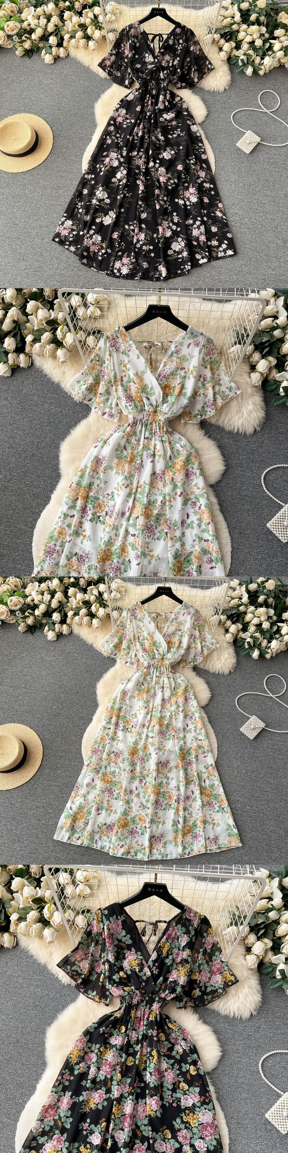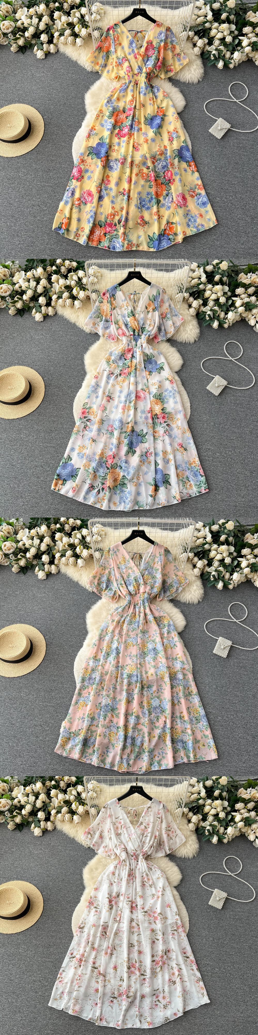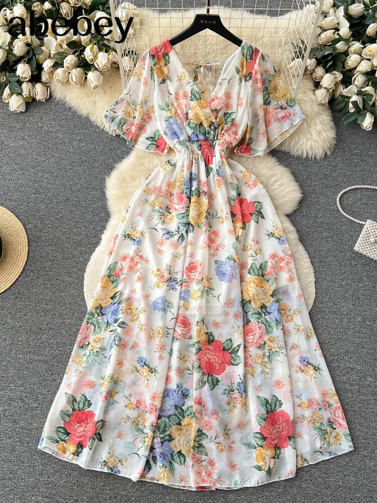 夏プリントドレス V ネック半袖ウエスト A ラインミディローブ休暇ビーチ Vestidos ショート ハーフスリーブ サマー 夏物 Vネック Aライン