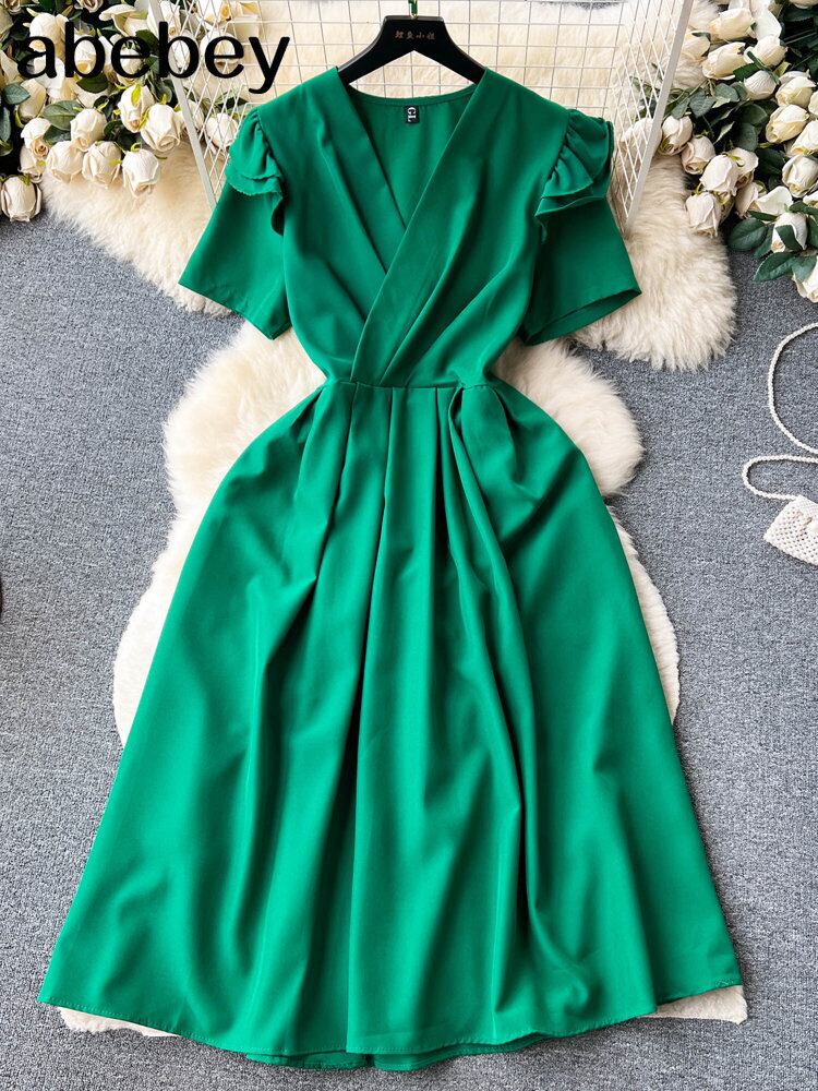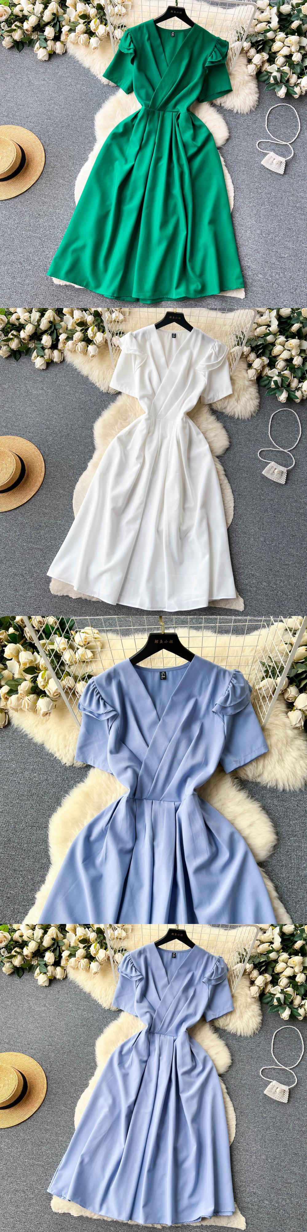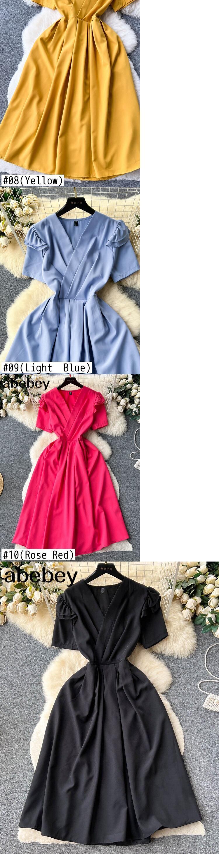 ベーシックドレス V ネックショートソリッドシャーリングパフスリーブシャーリングフレンチレトロソリッドロングドレス ソリッドカラー