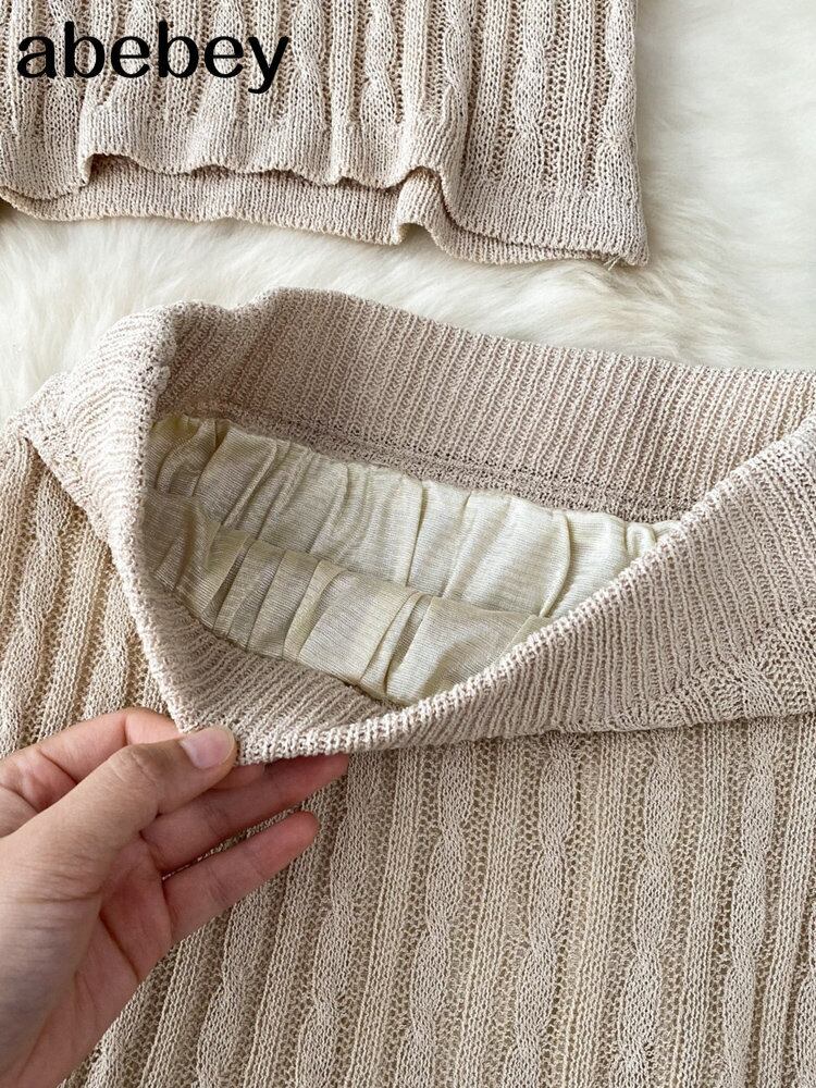 ニットスーツターンダウン襟半袖クロップトップ + ウエストゴムボディコンミニスカート 2 枚セット ショート ハーフスリーブ エラスティック 伸縮 ソリッドカラー