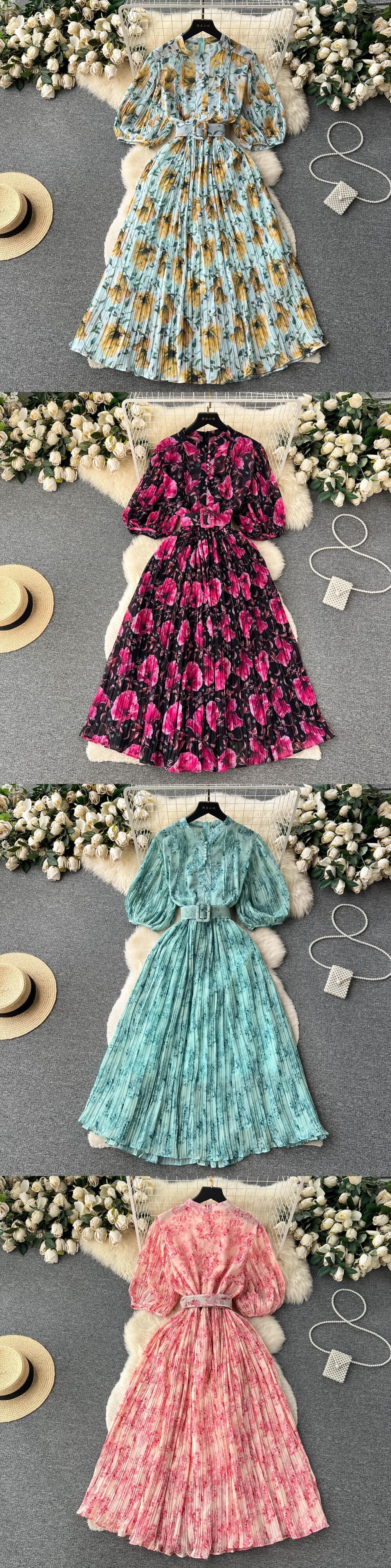 夏プリントプリーツロングドレス O ネックランタンスリーブウエスト A ラインドレープマキシローブ サマー 夏物 Oネック Aライン