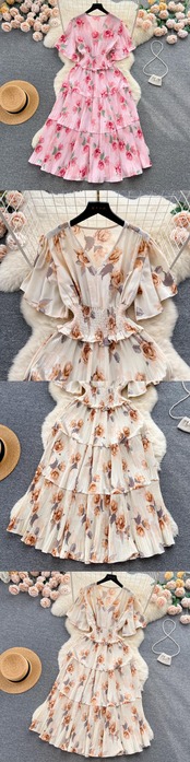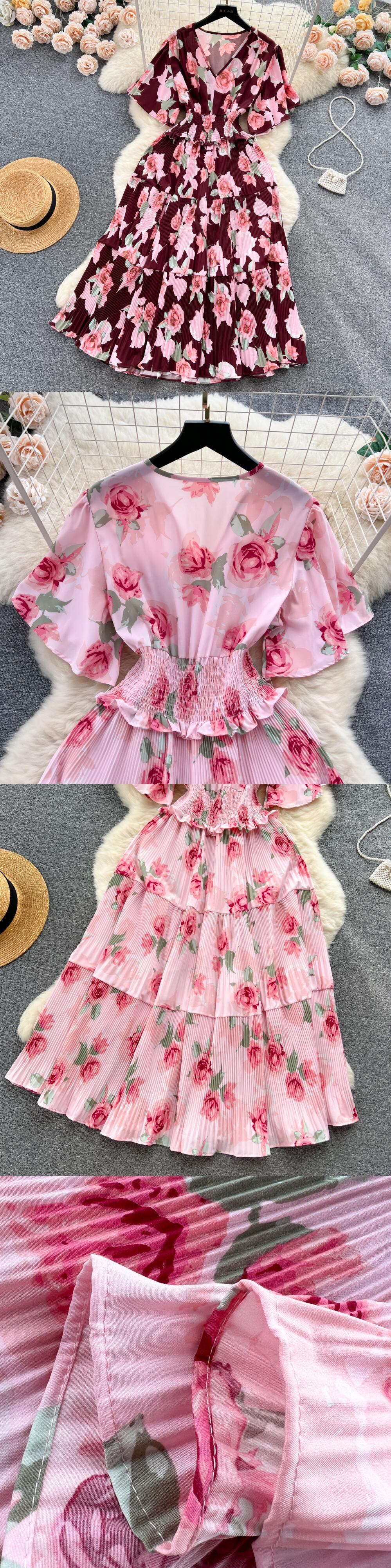 フレンチセクシープリントドレス弾性ウエスト V ネックシャーリングフレアスリーブ夏ビーチ休暇花柄ロングドレス レッド エラスティック 伸縮 サマー 夏物 Vネック