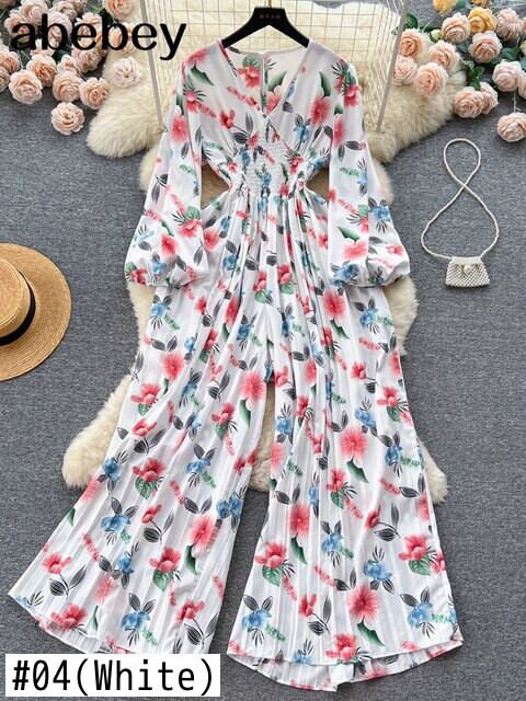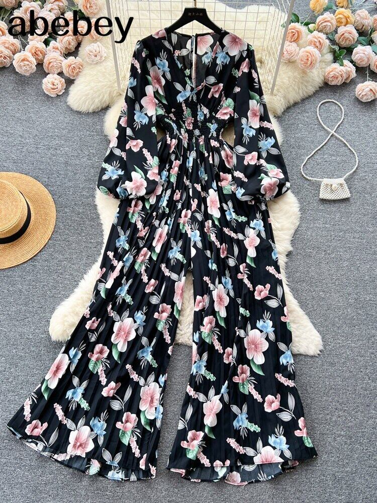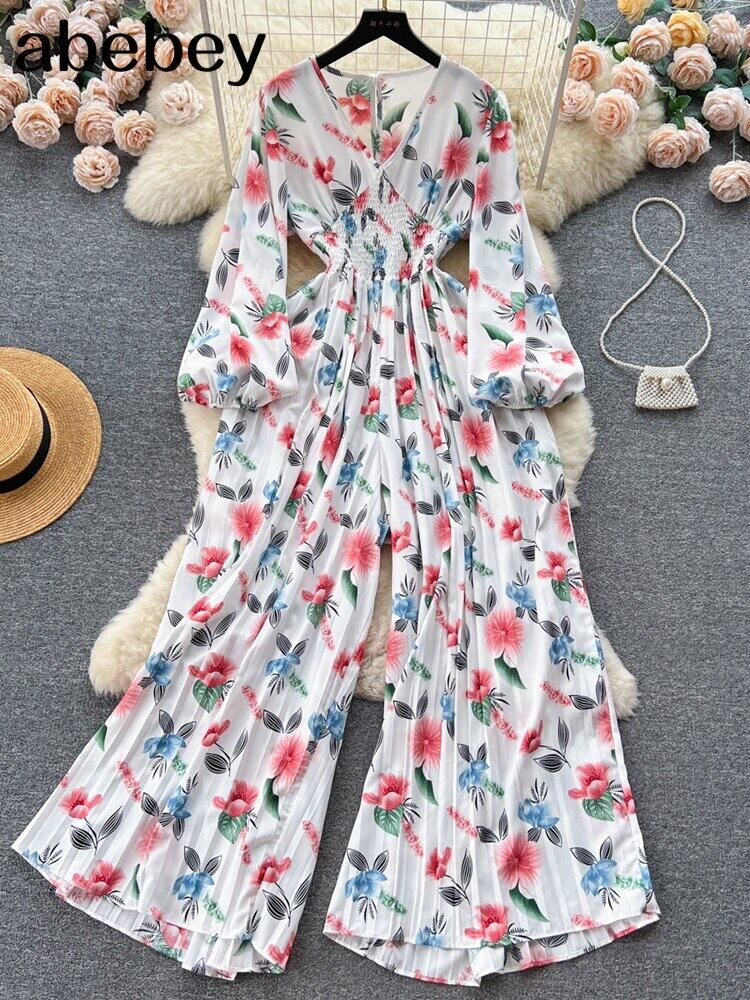 夏フララルロンパースセクシー V ネックパフ長袖ウエストプリーツワイドレッグジャンプスーツ ロング サマー 夏物 Vネック ワイドパンツ
