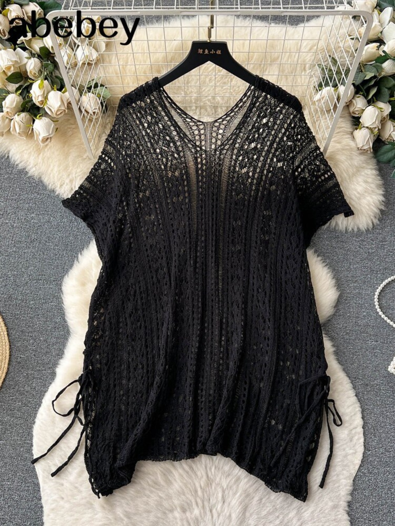 ビキニカバーアップ長袖かぎ針編み中空アウト電話ビーチドレスシースルーセクシービーチウェアカバーアップ ロング