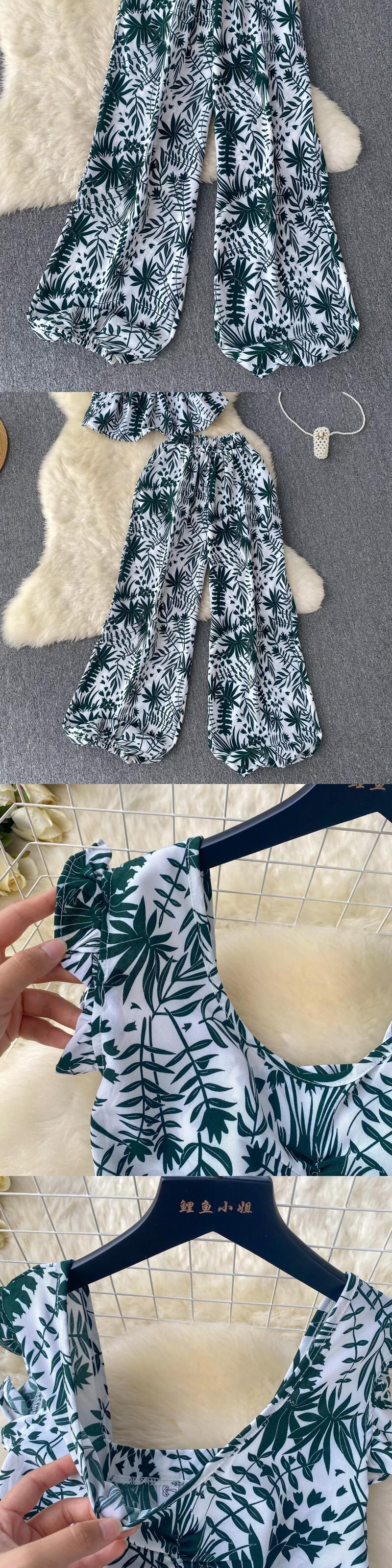 夏セクシーパンツセット花柄タンクトップワイドレッグロングパンツスーツスリム休暇ツーピースセット サマー 夏物