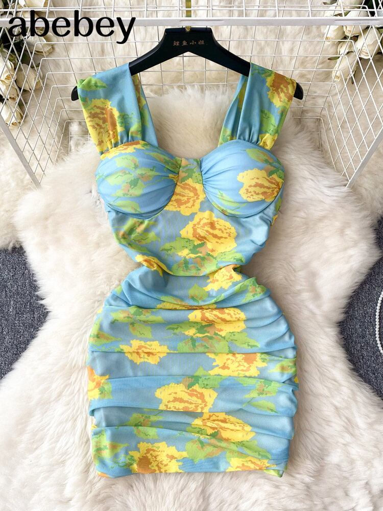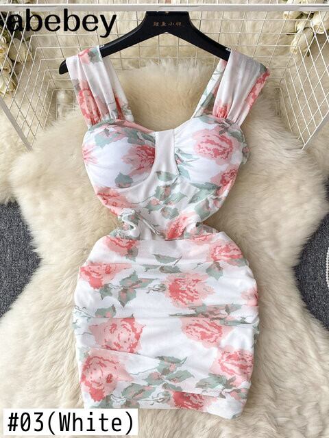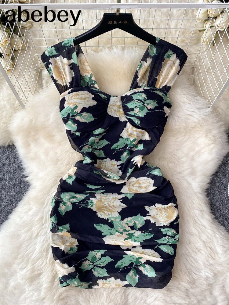ストラップフローラルセクシードレスノースリーブフリルバックレスAラインホットスイートバケーションプリントビーチサンドレス ラッフル 大人ガーリー スウィート キュート カジュアル 花柄