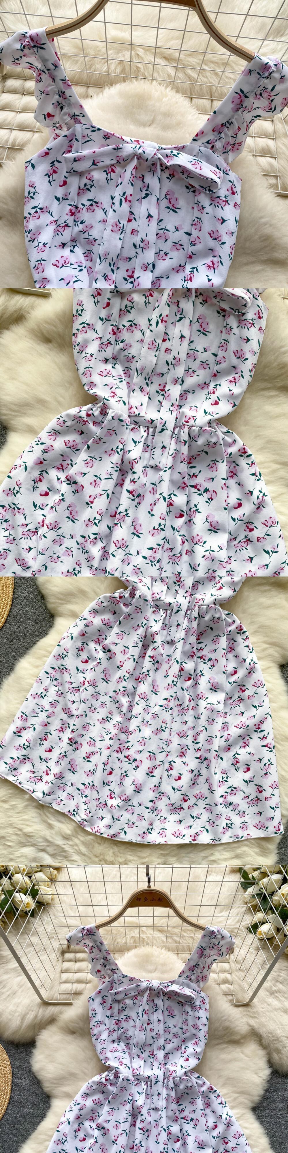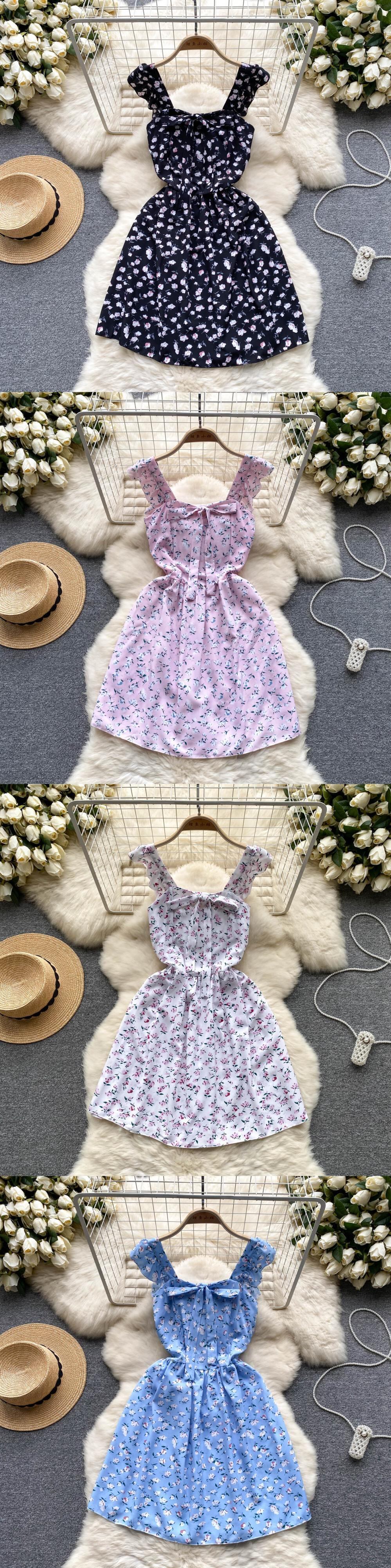 シックサンドレス弓襟フリルタンク背中開いた花柄スタイルホットスウィートソリッドミニドレス リボン ラッフル 大人ガーリー キュート カジュアル ソリッドカラー