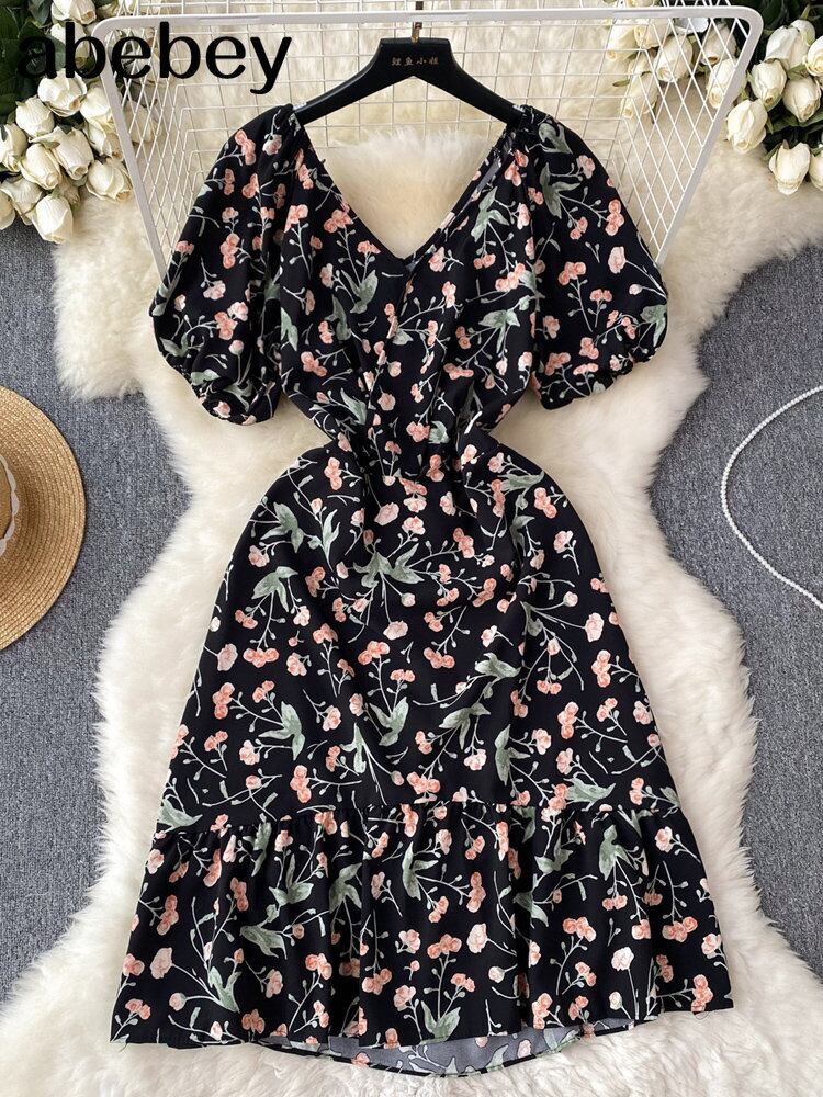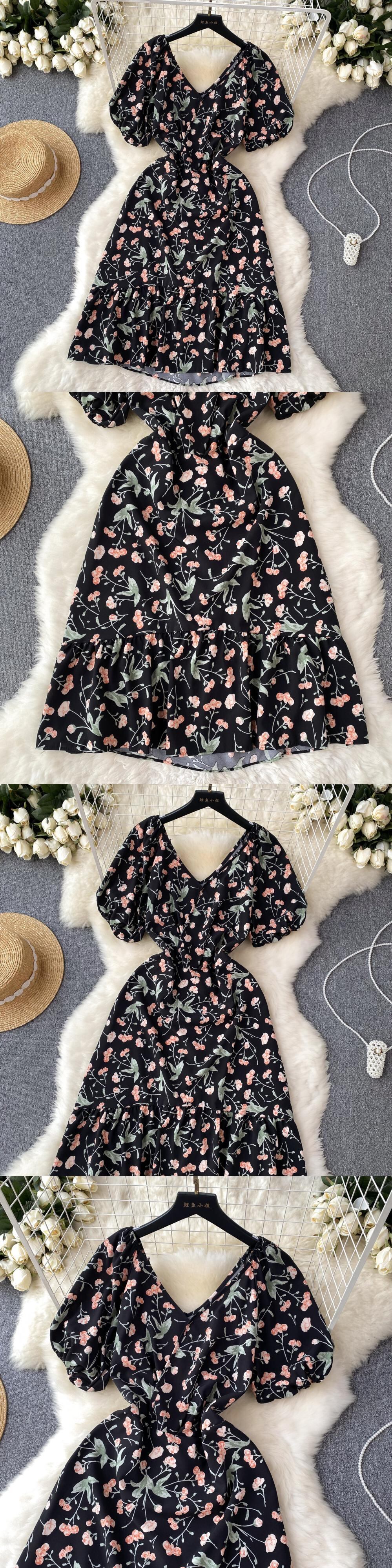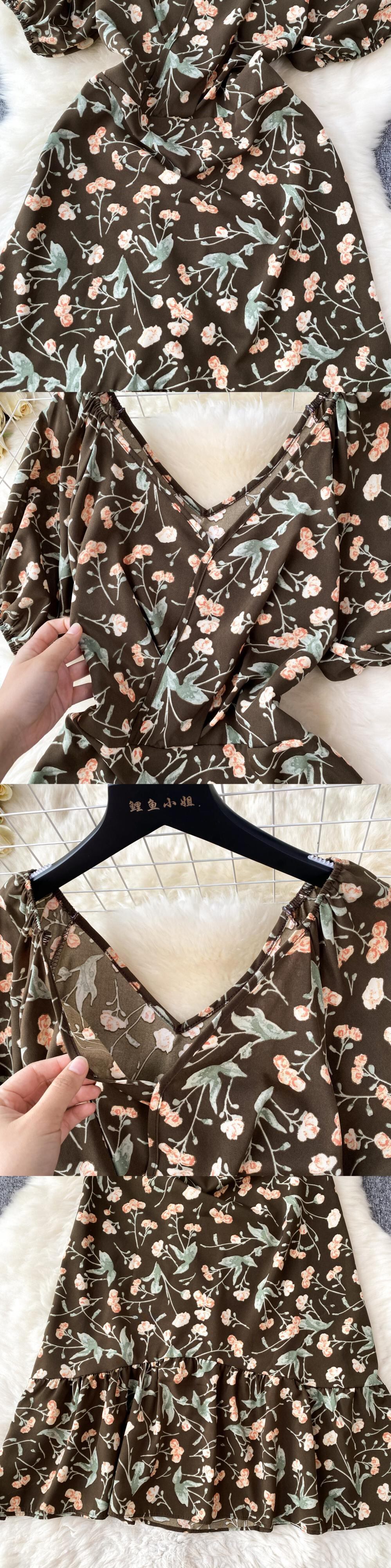 フランスミニドレス V ネックブラックレスレースアップ半袖花柄不規則フリルボディコンドレス ショート ハーフスリーブ ラッフル Vネック
