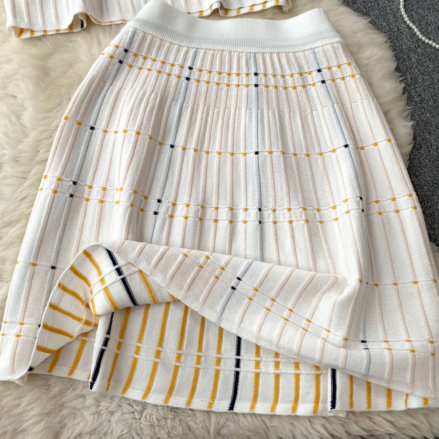 優しいニットスーツターンダウン襟半袖トップ + 弾性ウエストショートボディコンスカート 2 枚セット ハーフスリーブ エラスティック 伸縮