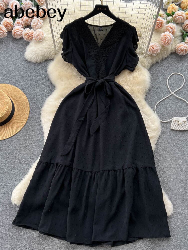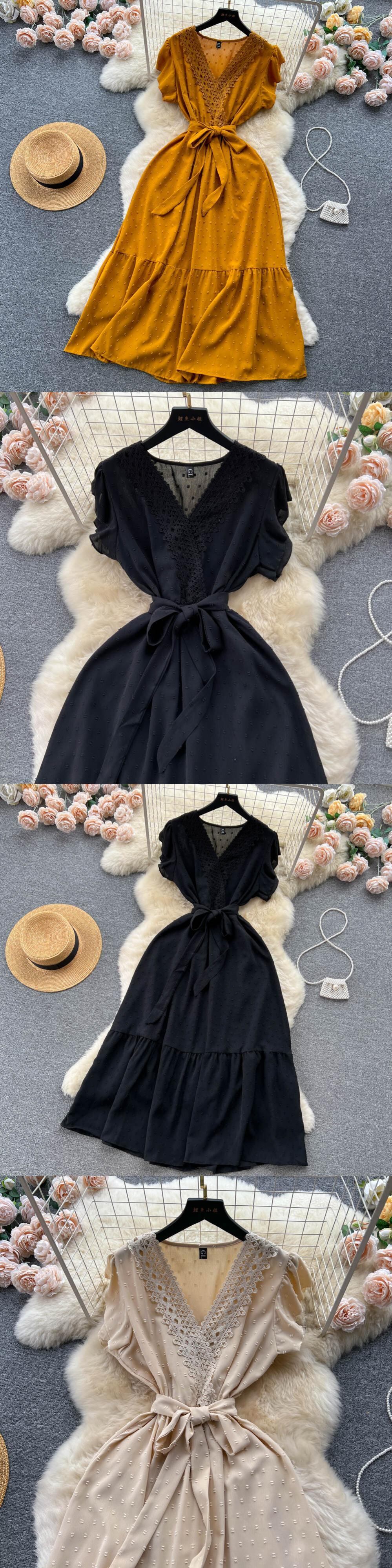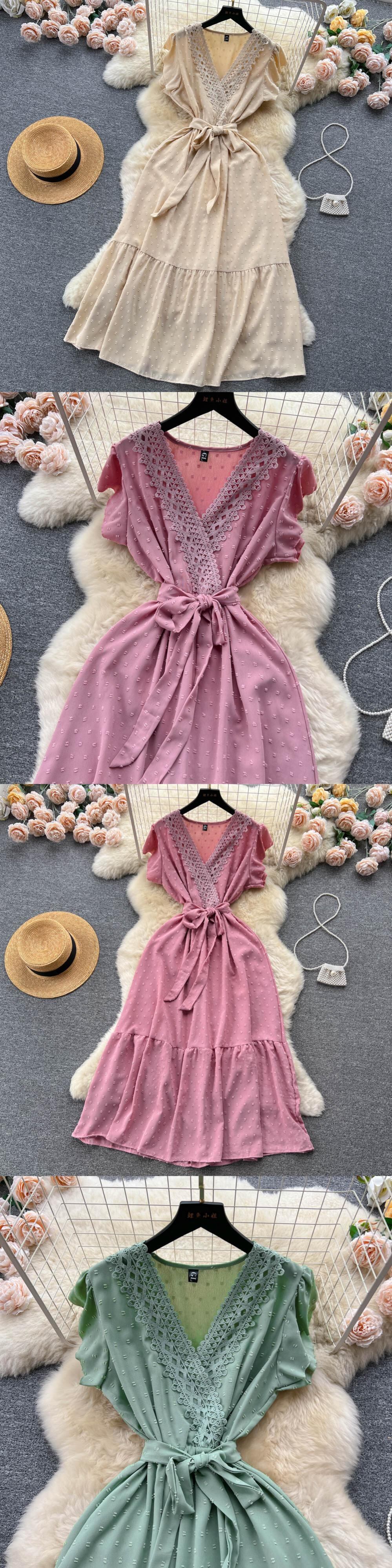 優しいルーズドレス V ネックベルトショートパフスリーブフリルプリーツフランスレトロ A ラインサンドレス ラッフル ハーネス Vネック Aライン ソリッドカラー