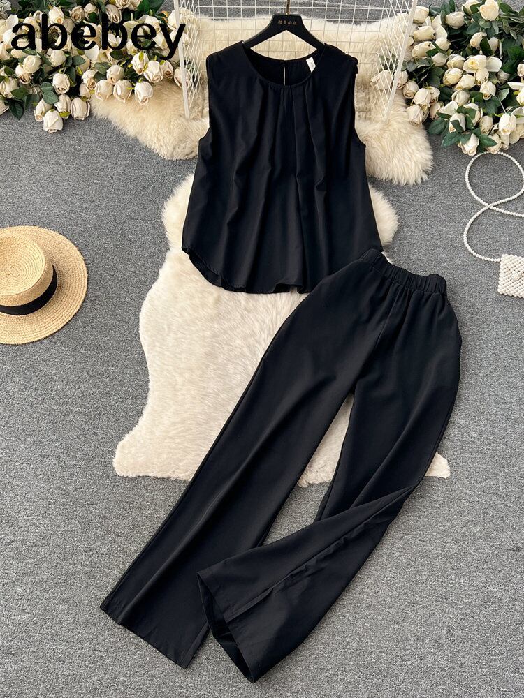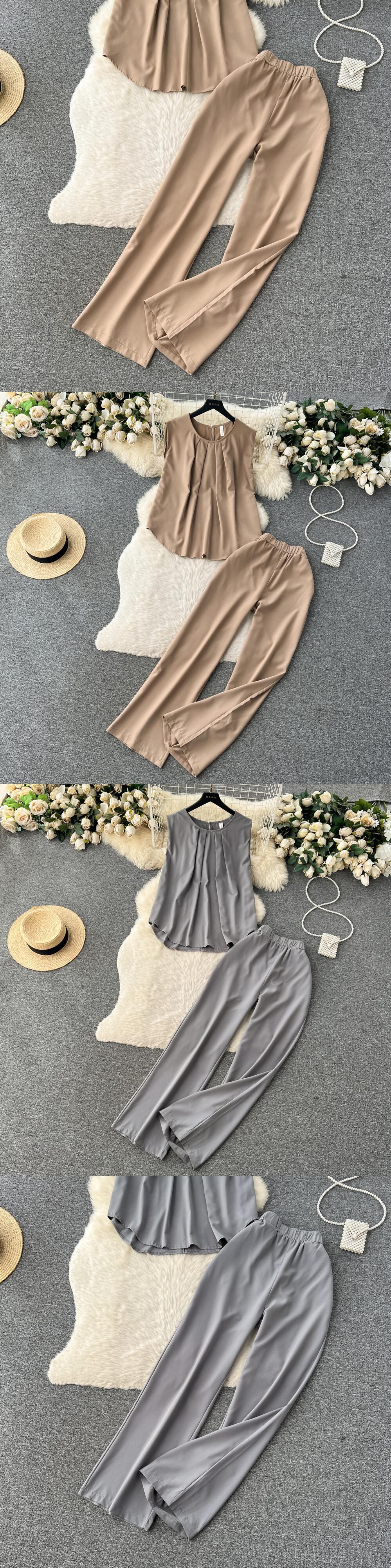 セット O ネックノースリーブトップ + 巾着ロングパンツサファリスタイルスーツ Oネック ソリッドカラー