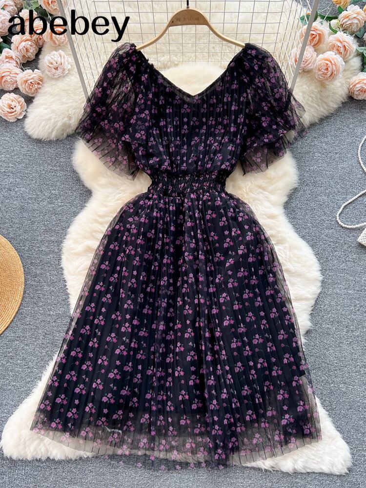メッシュドレスショートパフスリーブフリルフックフラワー刺繍フランスシック A ラインケーキサンドレス ラッフル Aライン ソリッドカラー フラワーデザイン