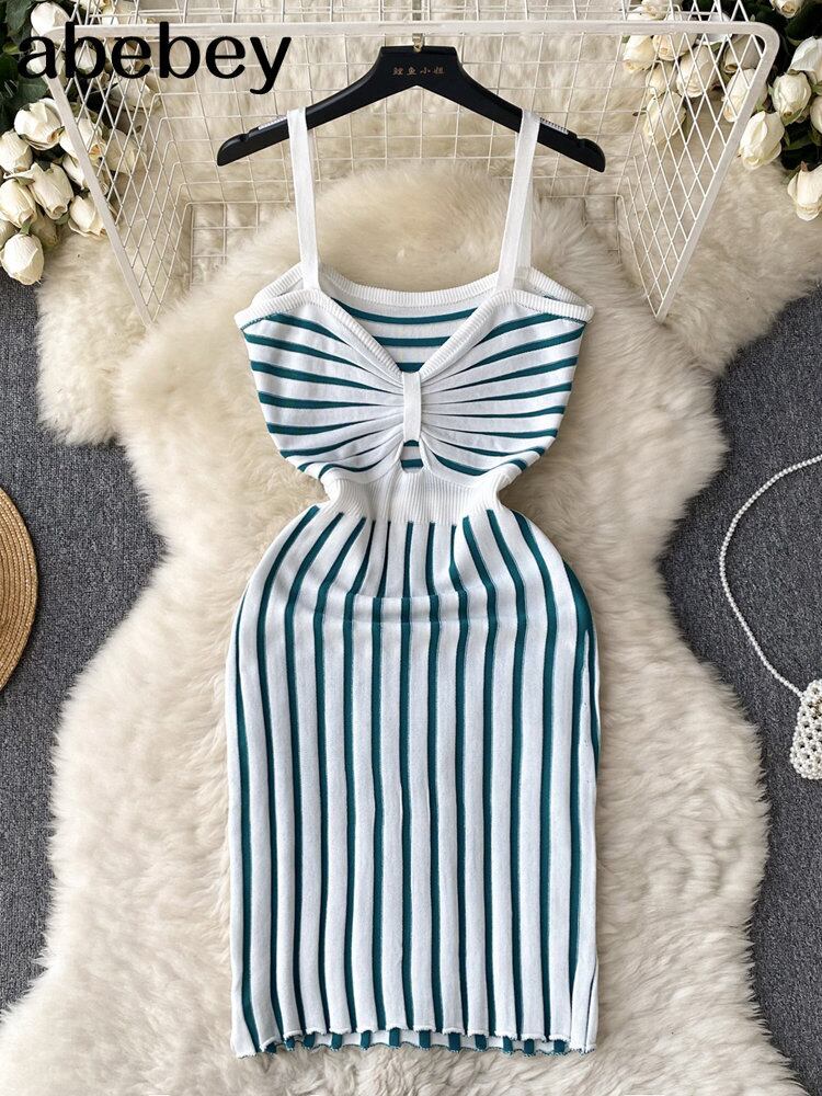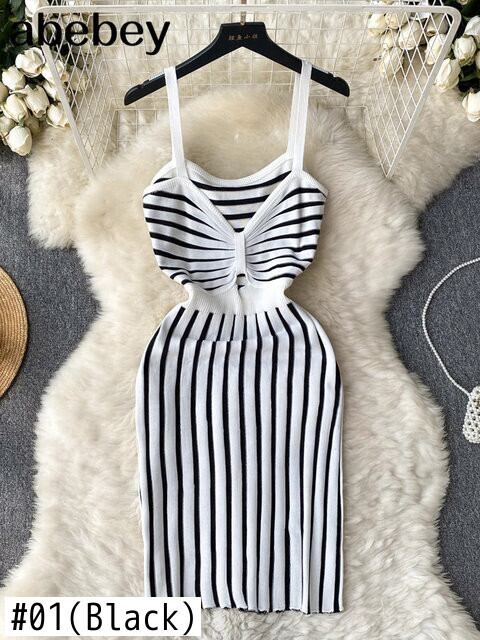 トレンドニットラップドレスノースリーブオフショルダー V ネック中空アウト夏ストライプセクシースリムドレス サマー 夏物 Vネック
