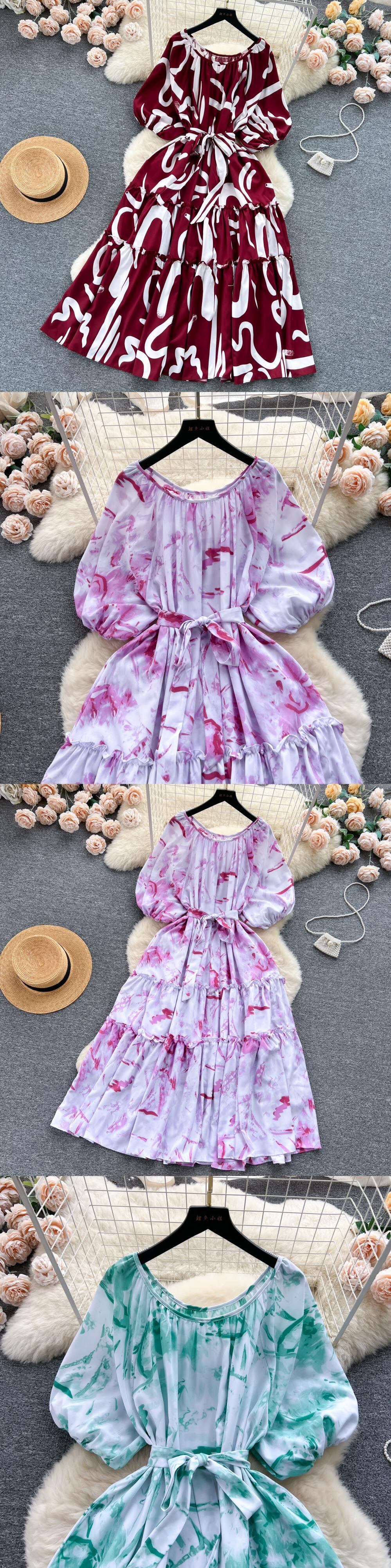 シフォンロングドレス O ネックバックレスレースアップリボン弾性ウエスト夏ビーチ休暇プリントドレス エラスティック 伸縮 サマー 夏物 Oネック