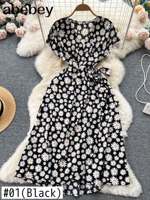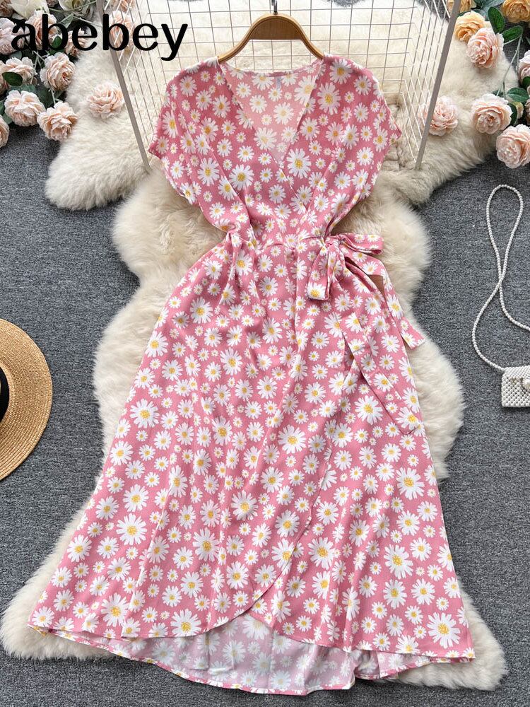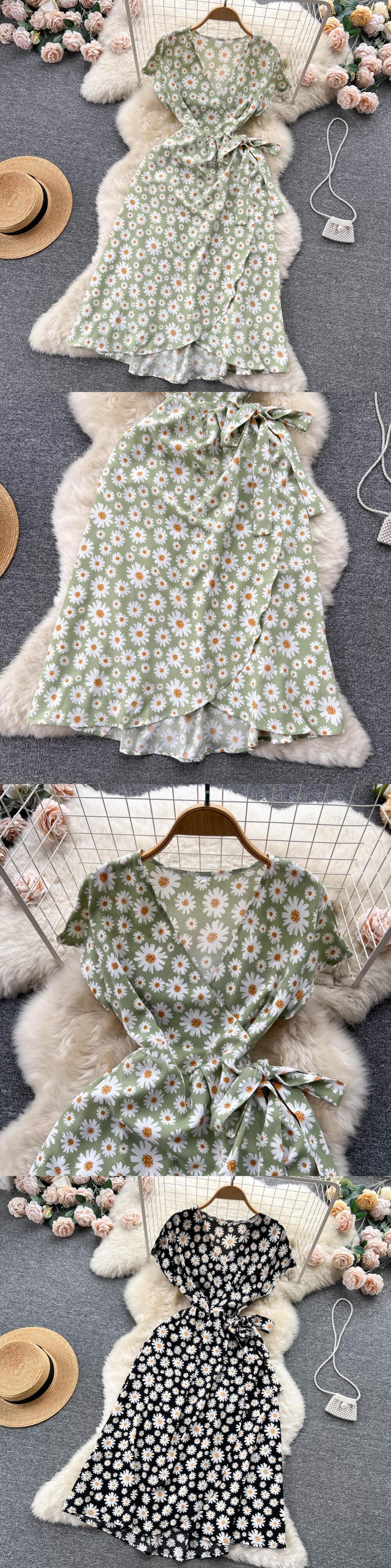 夏休み花ビーチラップドレス V ネック半袖シック A ラインドレスボヘミアンプリントロングドレス ショート ハーフスリーブ サマー 夏物 花柄 Vネック Aライン