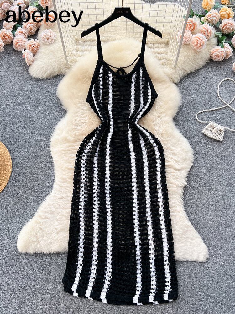 ストリートニットスリングドレス中空アウトバックレスレースアップ弓ストライプスプリットスタイルビーチサンドレス リボン