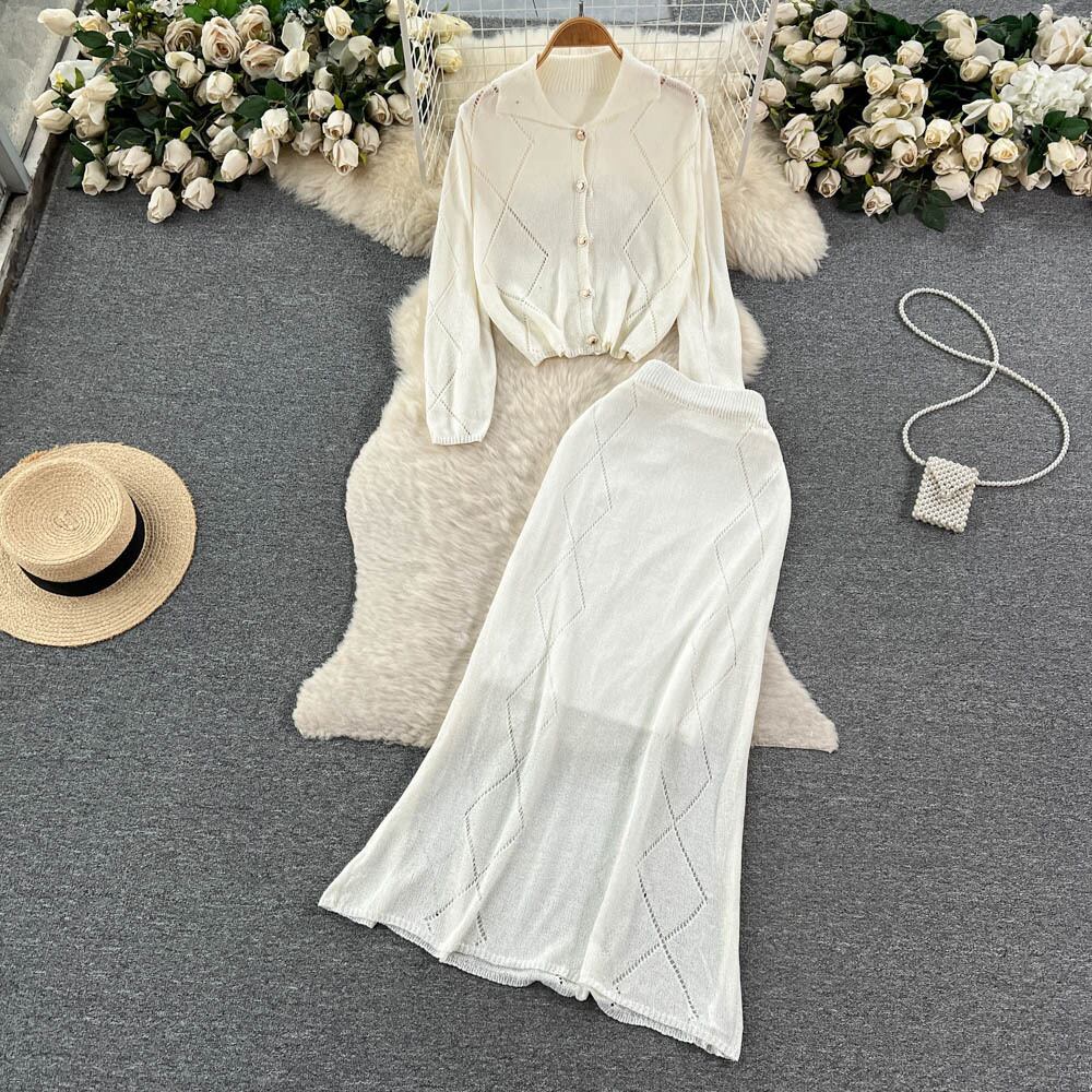 ビーチ 2 枚セット夏中空アウトニットトップ + 弾性ウエストロングマーメイドロングスカートセットセクシー 2 枚スーツ エラスティック 伸縮 サマー 夏物 ソリッドカラー