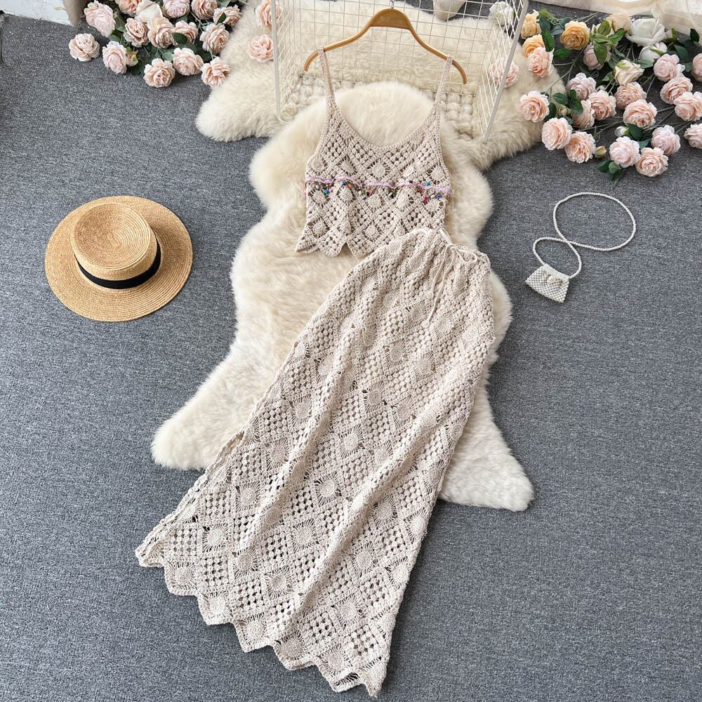 中空アウトニットセクシースーツ夏スリムキャミソール + ロングスカートセットストリート休暇ビーチ 2 個セット サマー 夏物